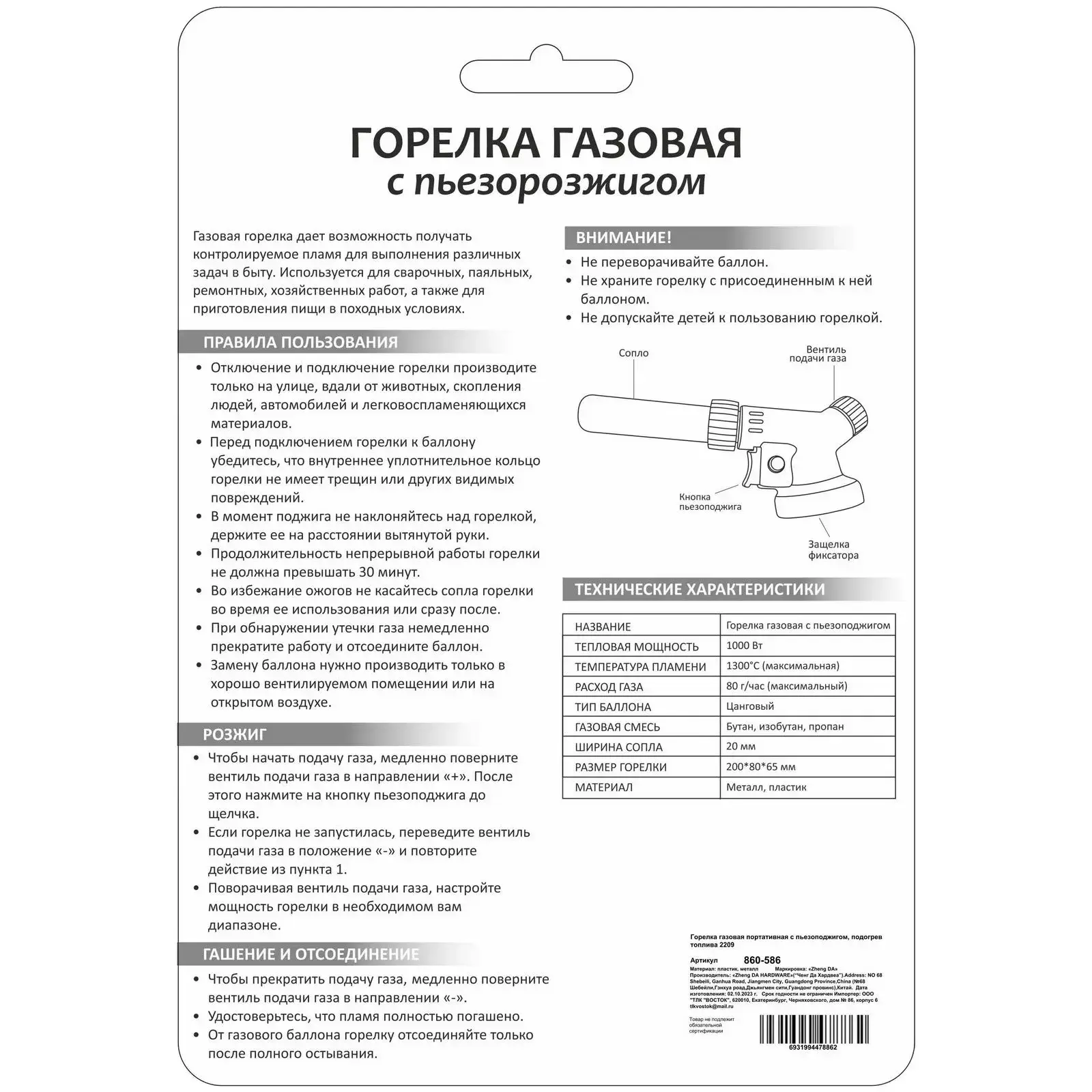 Горелка имеет длину 20 см и мощность 1800 Вт, что делает её мощным инструментом для приготовления пищи. Изготовлена из качественных материалов: металл и пластик, что обеспечивает её надежность и долговечность. Не упустите возможность сделать ваши выезды на природу более комфортными и приятными с этой газовой горелкой!