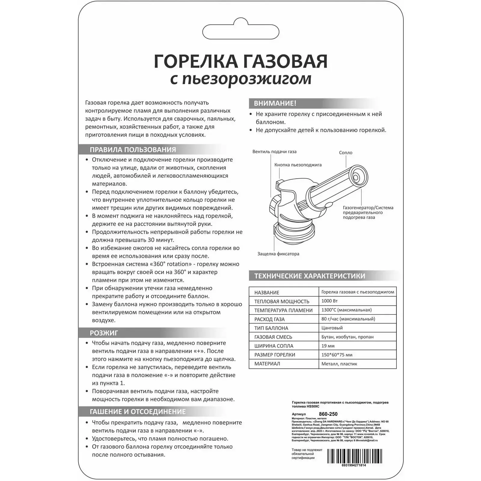 Горелка имеет размеры 150×67 мм, что делает ее компактной и удобной для хранения. Материалы, из которых она изготовлена — металл и пластик, обеспечивают надежность и легкость. Не забывайте о правилах использования: отключайте и подключайте горелку только на улице, вдали от легковоспламеняющихся материалов. Следуйте инструкциям, чтобы обеспечить безопасность при работе с горелкой.