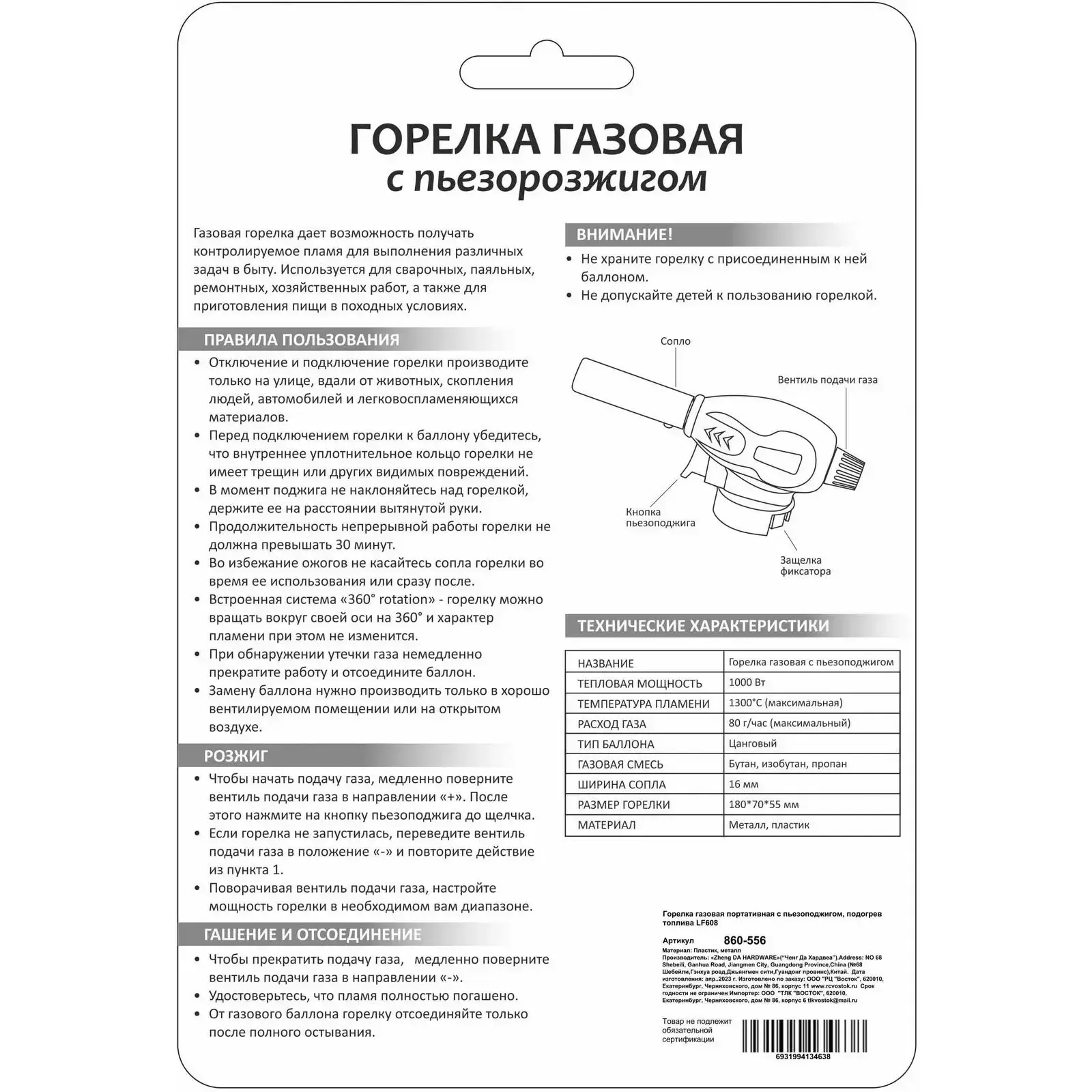 Горелка имеет черный пластиковый корпус и металлическую трубку для выхода пламени. Она оснащена регулятором пламени, что позволяет точно настраивать интенсивность огня. Максимальная температура пламени достигает 1300°C, а тепловая мощность составляет 1000 Вт. Обратите внимание на правила использования: горелку следует использовать только на открытом воздухе, вдали от легковоспламеняющихся материалов.