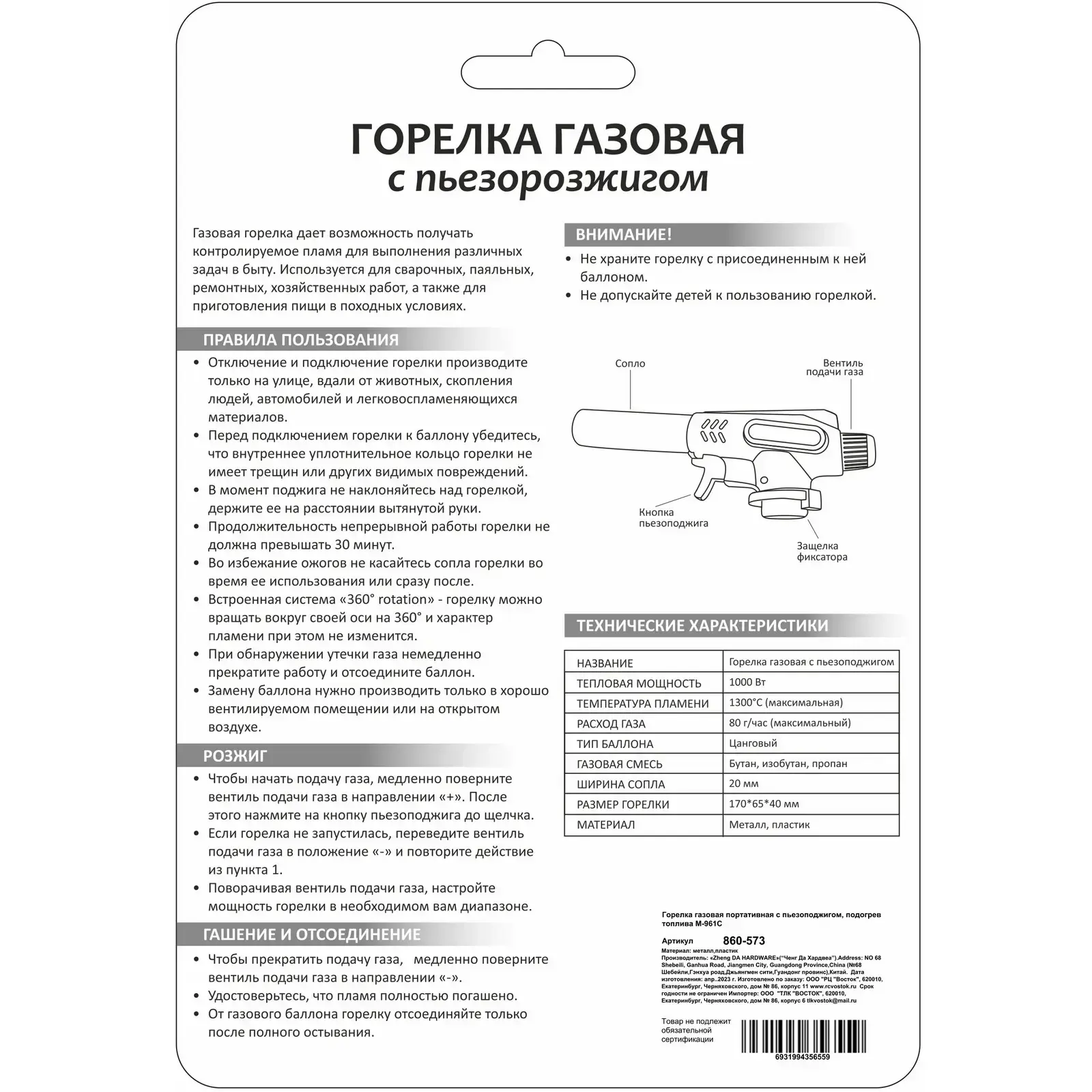 Горелка выполнена из качественных материалов: металлический корпус и пластиковая рукоятка обеспечивают долговечность и надежность. Размеры горелки составляют 170×65×40 мм, что делает её удобной для одной руки. Потребление газовой смеси составляет 100 г/час, а тепловая мощность — 1000 Вт. Используйте горелку M-961C для достижения отличных результатов в любых условиях!