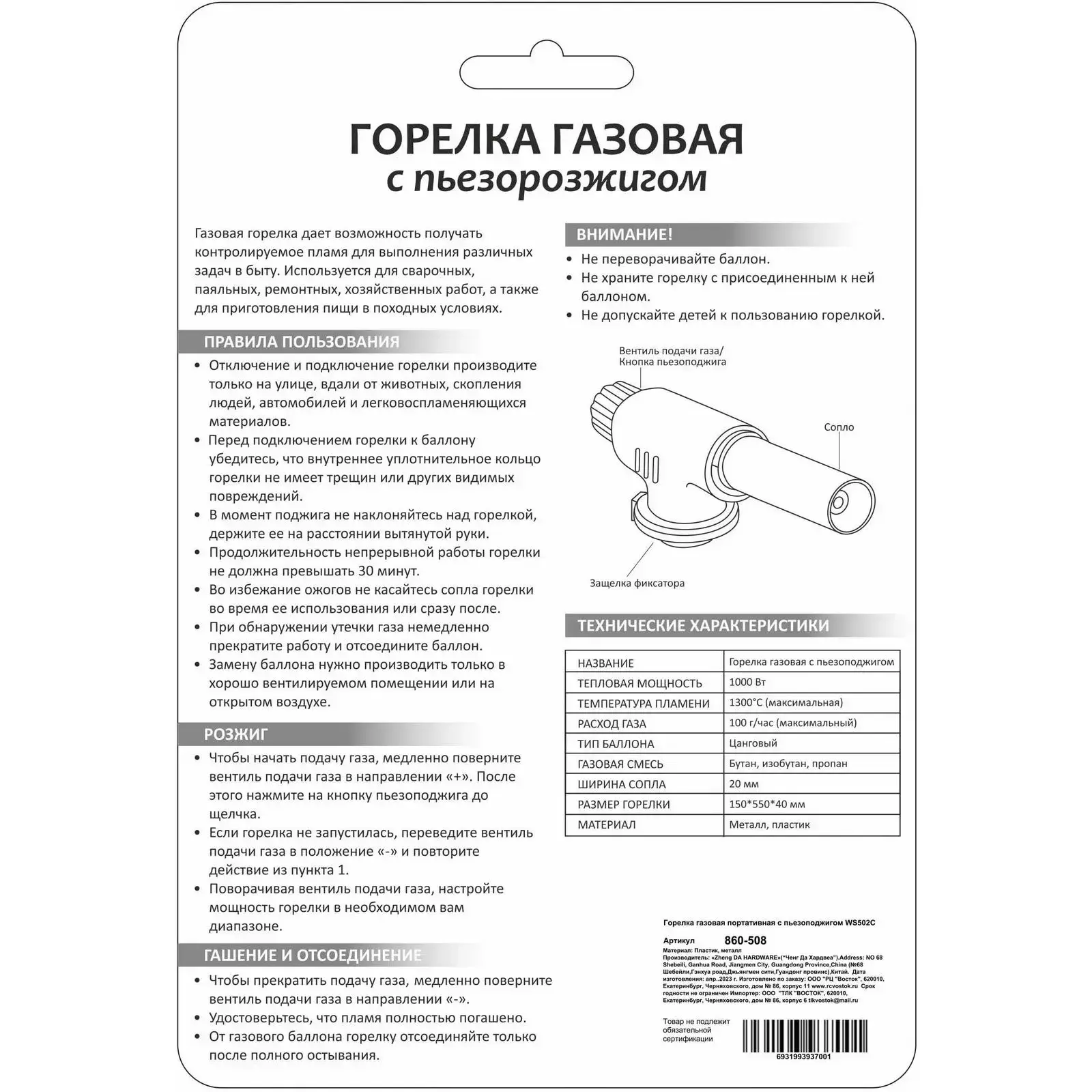 Горелка выполнена из металла и пластика, что обеспечивает ей прочность и легкость. Размеры горелки составляют 150×50×440 мм, а тепловая мощность достигает 1000 Вт с температурой пламени до 1300°C. Расход газа составляет 170 г/час, что делает ее экономичным решением для длительного использования.