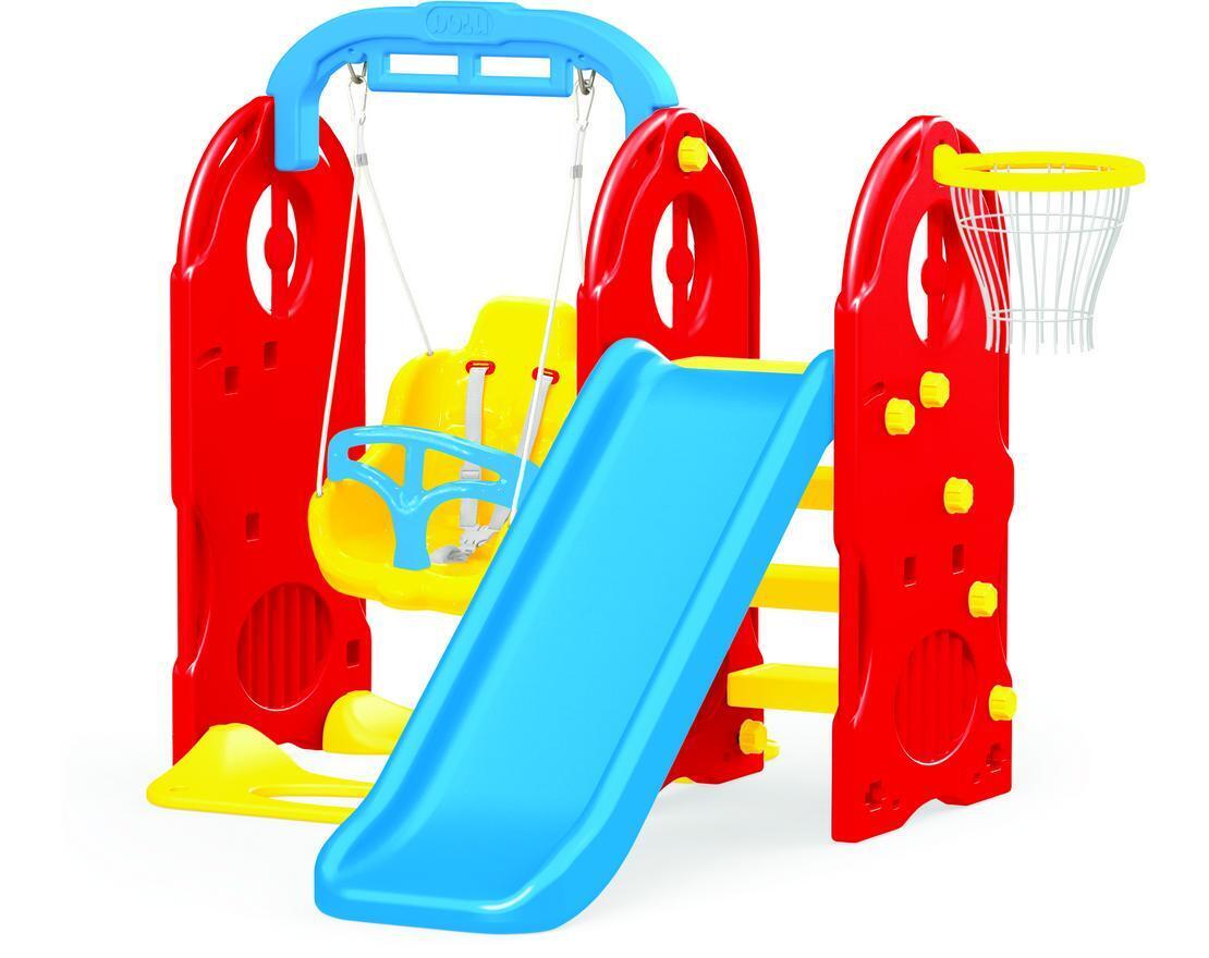 Игровой комплекс включает в себя гладкую синюю горку, качели с формовым сиденьем и корзину для мяча, что делает его универсальным для детей младшего возраста. Он подходит для использования как в домашних условиях, так и на улице, позволяя детям развивать физическую активность и координацию.