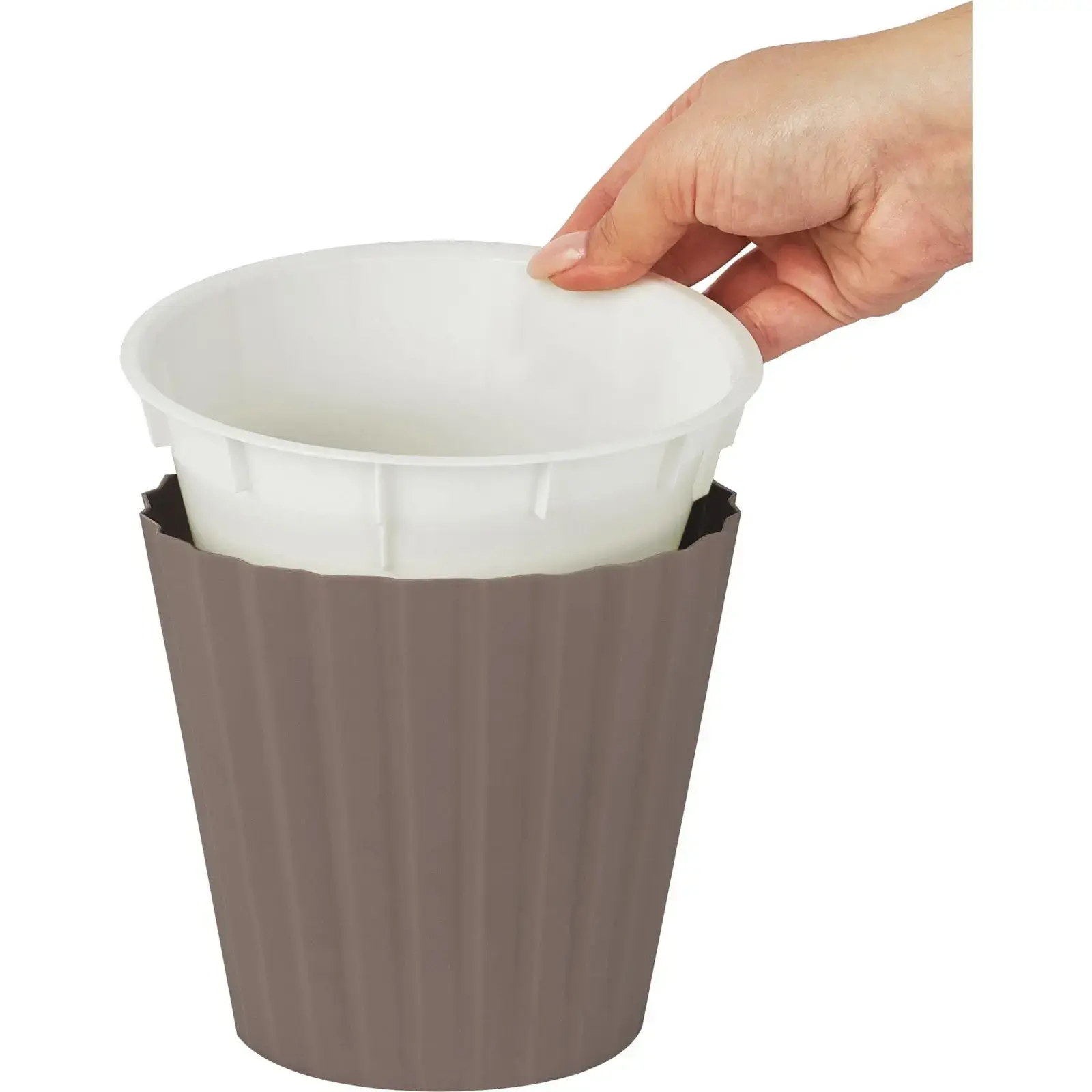 Размер горшка составляет 10,5 литров с диаметром 28 см, что делает его идеальным для большинства домашних растений. Внутренняя часть горшка белого цвета, что создает контраст с внешней текстурой и подчеркивает красоту ваших растений.
