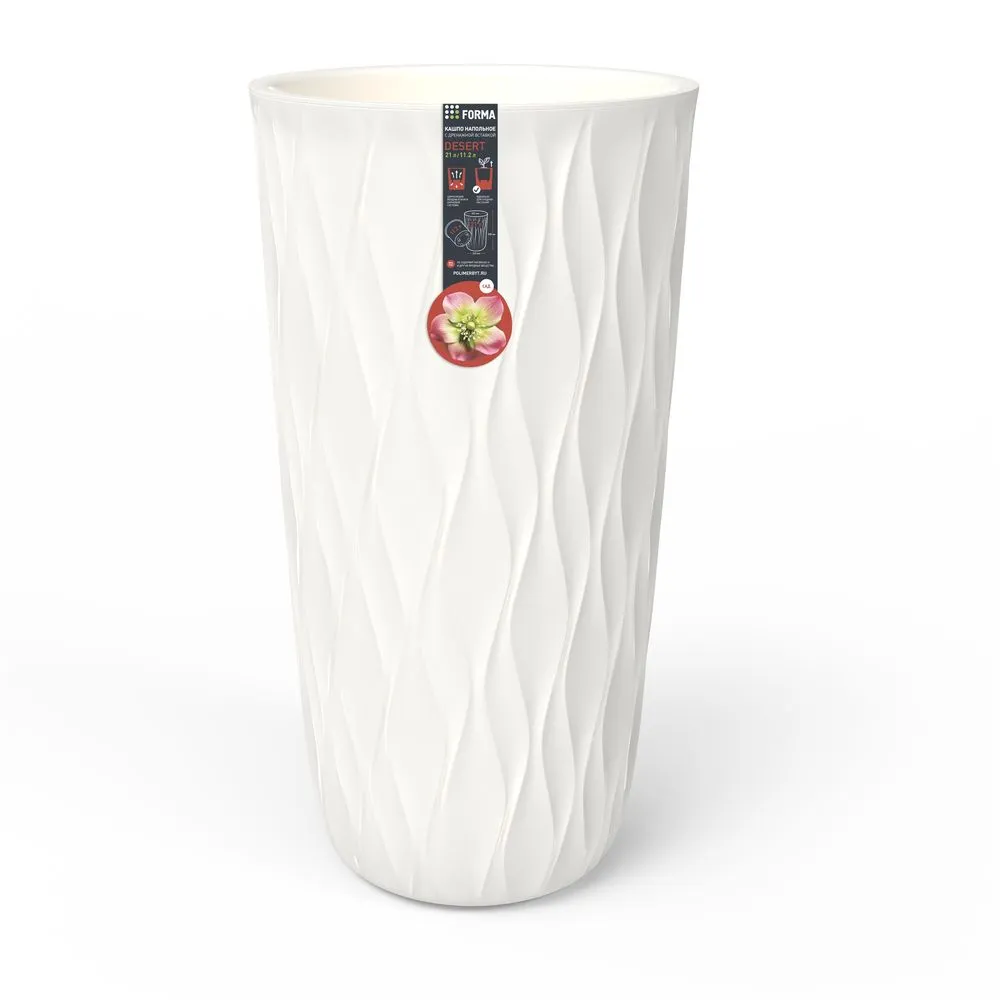 Высокое кашпо с рельефным узором создаст эффектную витрину для ваших комнатных или садовых растений. Его лаконичный дизайн и нейтральный молочный цвет гармонично впишутся в любой интерьер — от классики до современного минимализма, а также украсят балкон, террасу или уголок в саду.