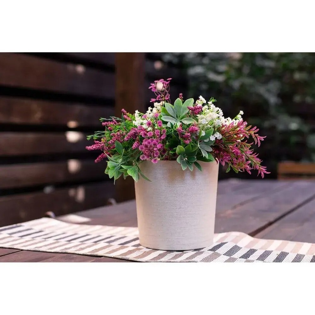 Пластиковый горшок цилиндрической формы сочетает экологичность материалов и продуманный дизайн. Дренажная система обеспечивает здоровый рост растений, предотвращая застой влаги.