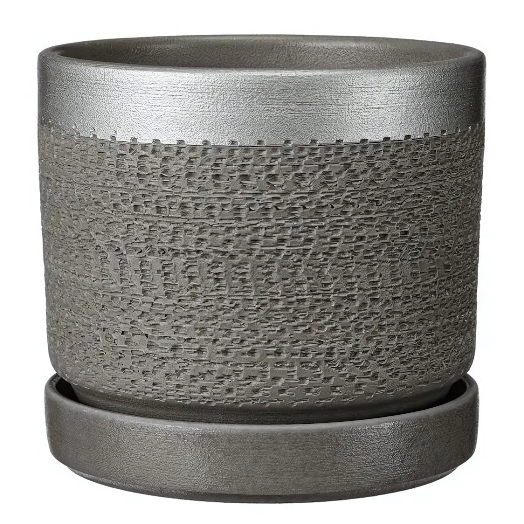 Керамический горшок серии «Брюссель» сочетает элегантность и практичность, подчеркивая красоту комнатных растений. Цилиндрическая форма с рельефным узором создаёт эффект ручной работы, а благородный серо-серебристый оттенок гармонично впишется в любой интерьер.
