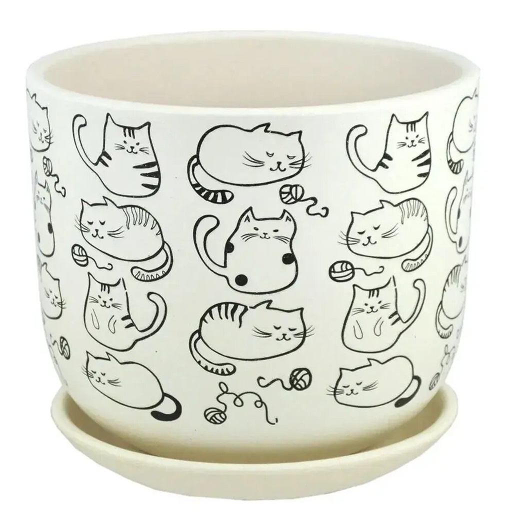 Горшок керамический с поддоном «Коты белый бук №1», рисунок кошки и клубки, белый