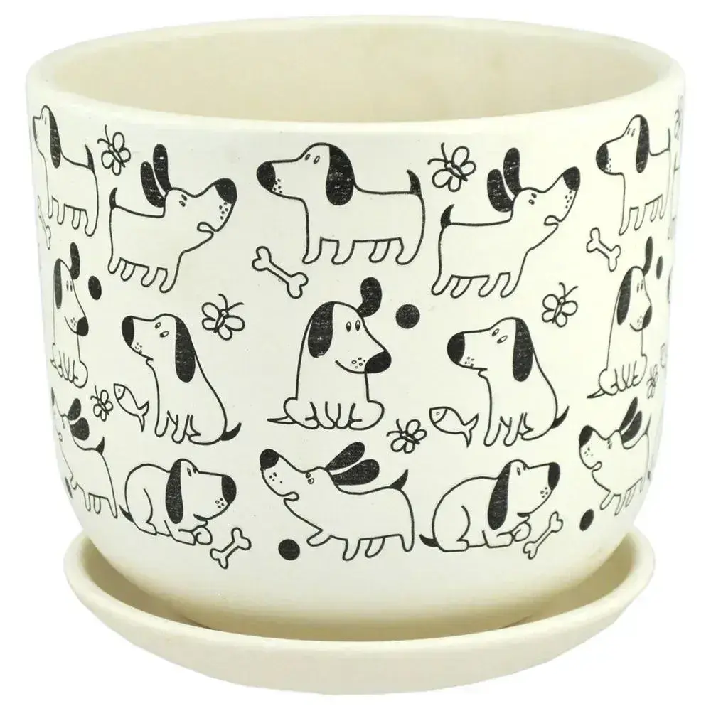 Горшок керамический с поддоном, рисунок собаки и цветы, цвет белый