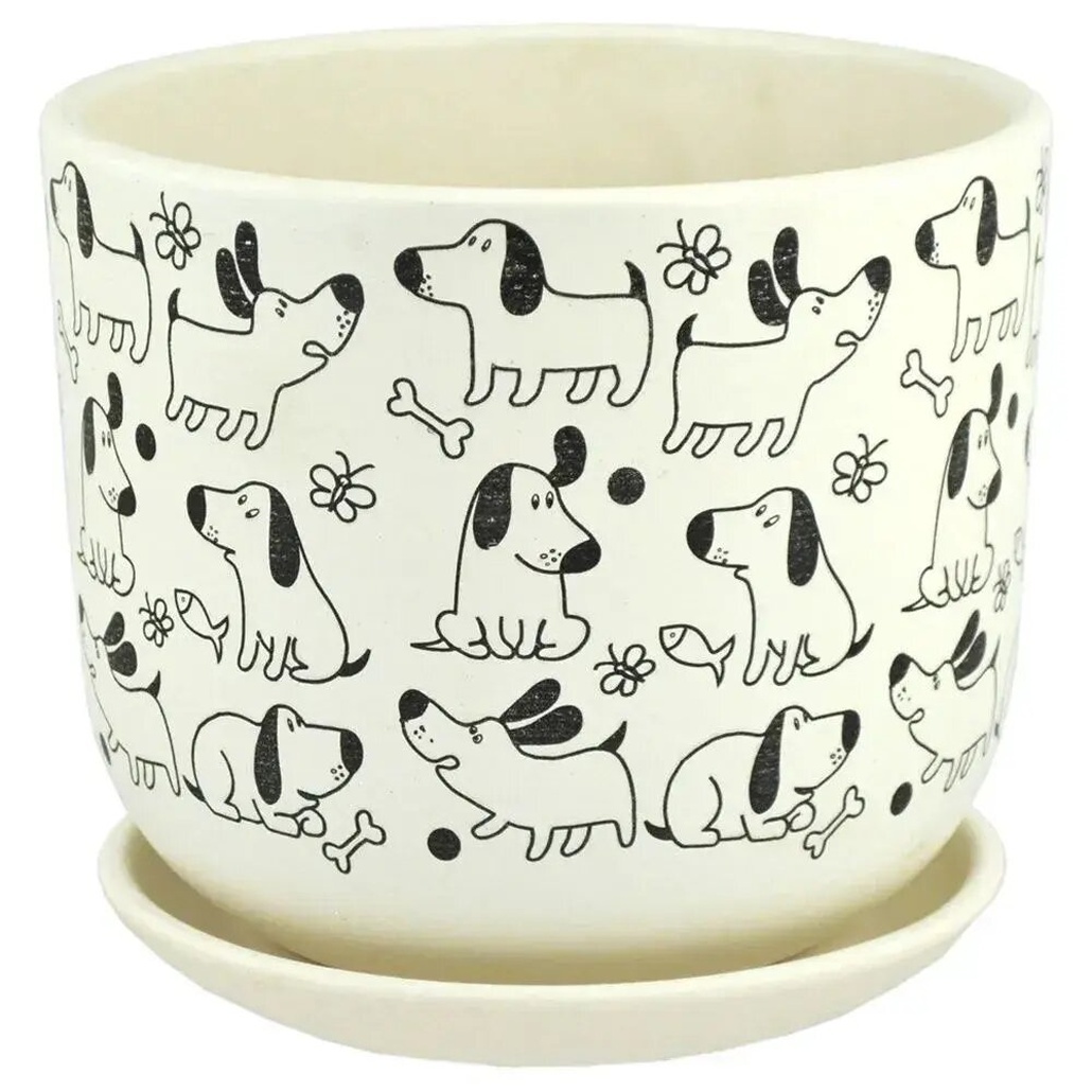 Горшок керамический "Собаки" белый с декором, дренажное отверстие, №2