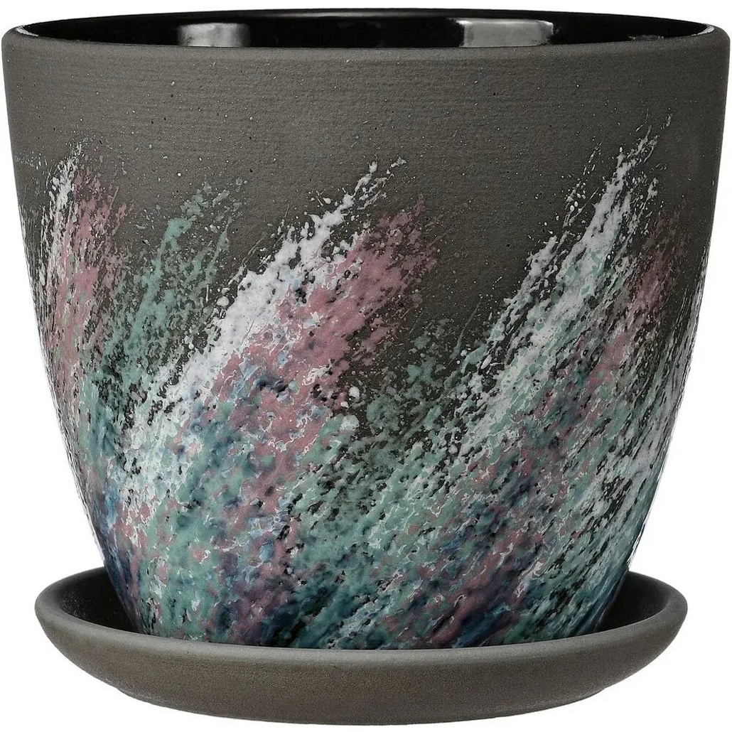 Керамический горшок с поддоном сочетает в себе природную эстетику и практичность. Градиентное покрытие с переходами от глубокого черного к нежным розовым и зеленым оттенкам создает эффект ручной росписи, а фактурная поверхность имитирует мазки кисти — такой вазон станет изысканным украшением интерьера.