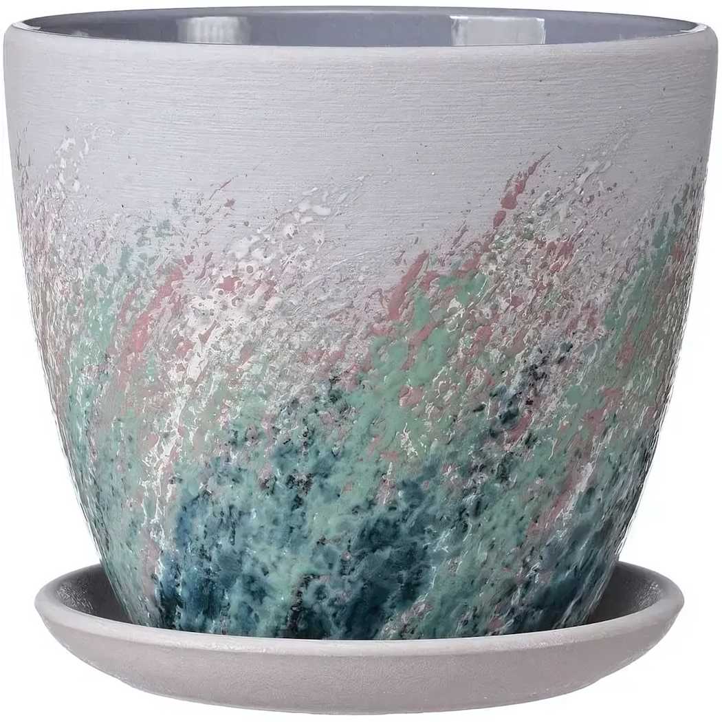 Текстура мазков создает эффект художественного полотна, а плавные цветовые переходы от пастельных тонов к насыщенным акцентам добавляют глубины композиции. Горшок поставляется в случайном цветовом варианте из коллекции: серо-голубые, зелено-розовые или сине-сиреневые градиенты.