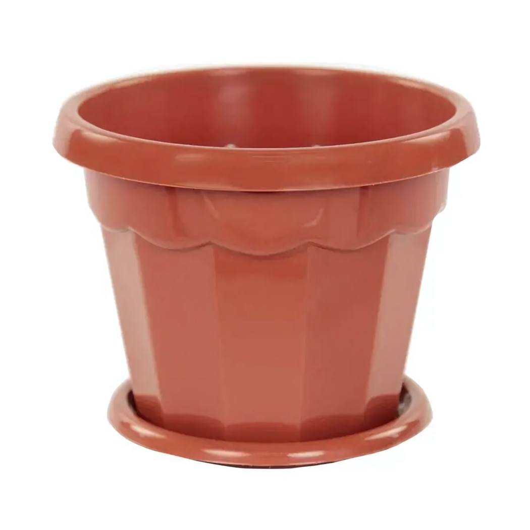 Пластиковый горшок с поддоном сочетает практичность и эстетику — идеальное решение для любителей комнатных растений. Рифлёная поверхность создаёт эффект натуральной керамики, а встроенная дренажная система защищает корни от переувлажнения.