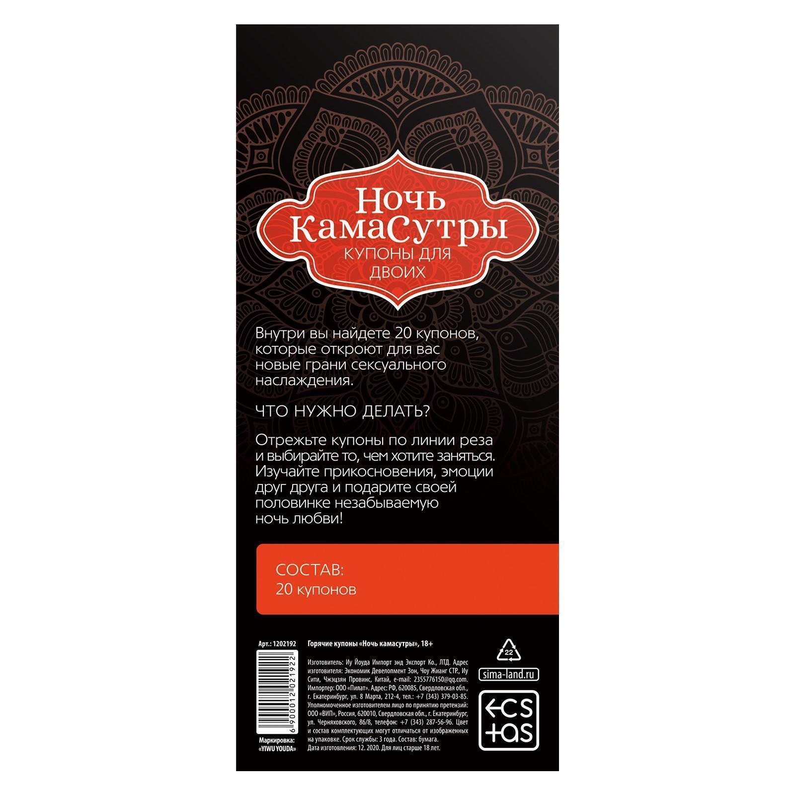 С набором 'Ночь Камасутры' вы откроете новые горизонты наслаждения и страсти. Эти купоны созданы для того, чтобы добавить яркие эмоции в ваши отношения и сделать каждую ночь незабываемой. Забудьте о скуке и рутине, ведь с этими купонами вы сможете экспериментировать и открывать новые грани удовольствия.