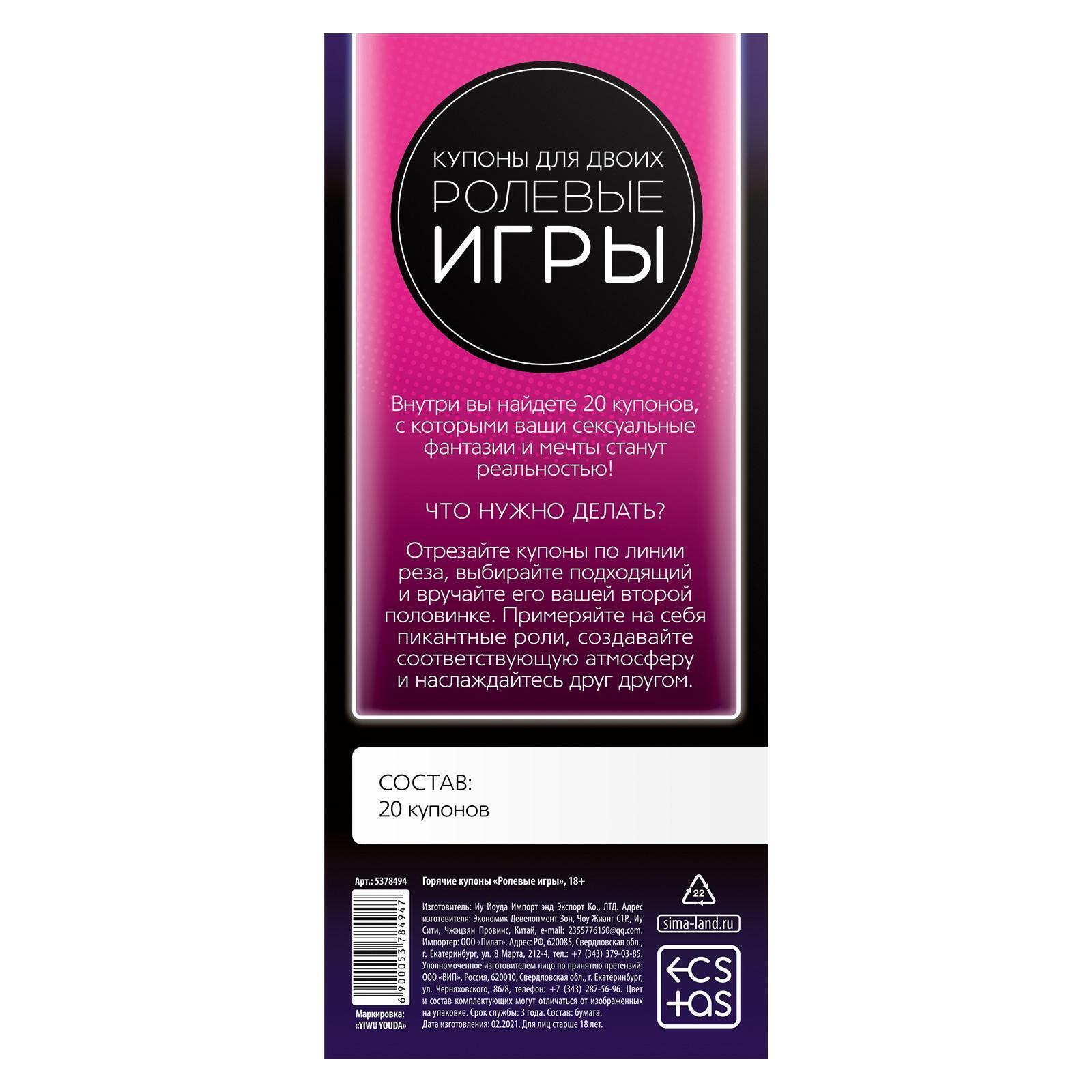 С этими купонами ваши сексуальные фантазии и мечты станут реальностью! Они помогут вам и вашему партнеру открыть новые грани интимной жизни и добавить в неё яркие эмоции. Просто листайте страницы, выбирайте понравившуюся ролевую игру и воплощайте её в жизнь. А если добавить соответствующий реквизит и музыку, атмосфера станет ещё горячее!