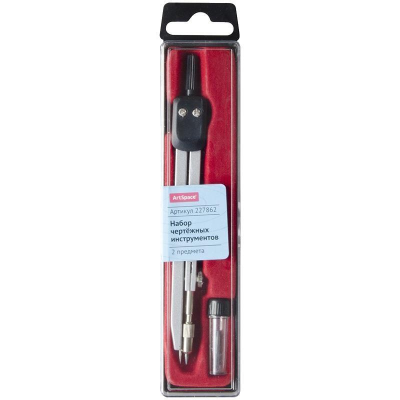 Комплектация из 2 предметов включает основной инструмент и запасные расходники для работы. Циркуль длиной 135 мм оптимален для форматов А4-А2. Прозрачная упаковка с красным акцентом позволяет оценить содержимое перед покупкой.
