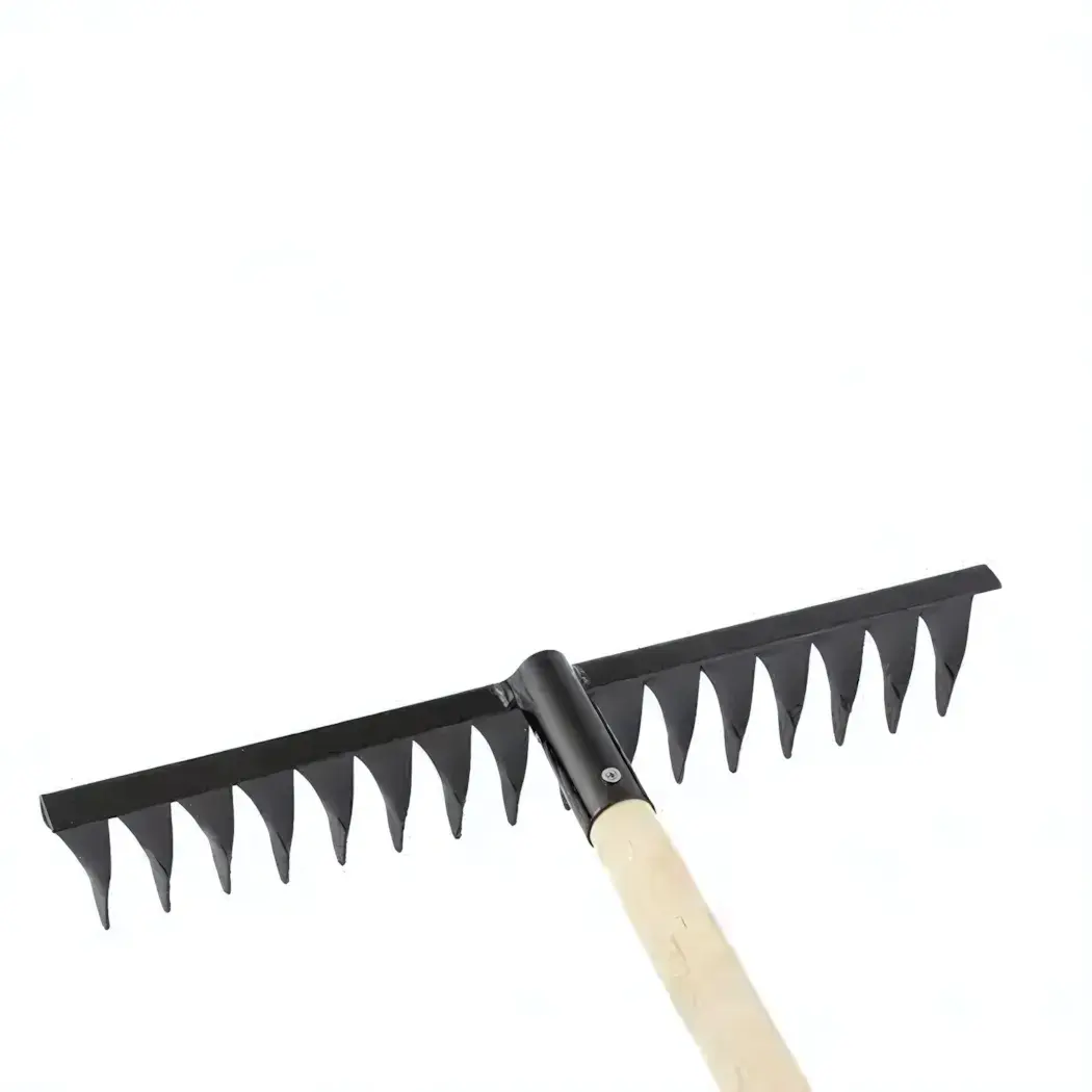 Усиленная конструкция с 16 витыми зубьями из стали позволяет эффективно справляться с плотными комьями земли, что делает процесс подготовки почвы быстрым и легким. Острая форма зубьев обеспечивает надежный захват перегноя и листьев, что значительно экономит ваше время и усилия.