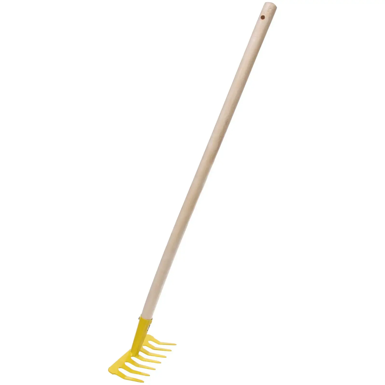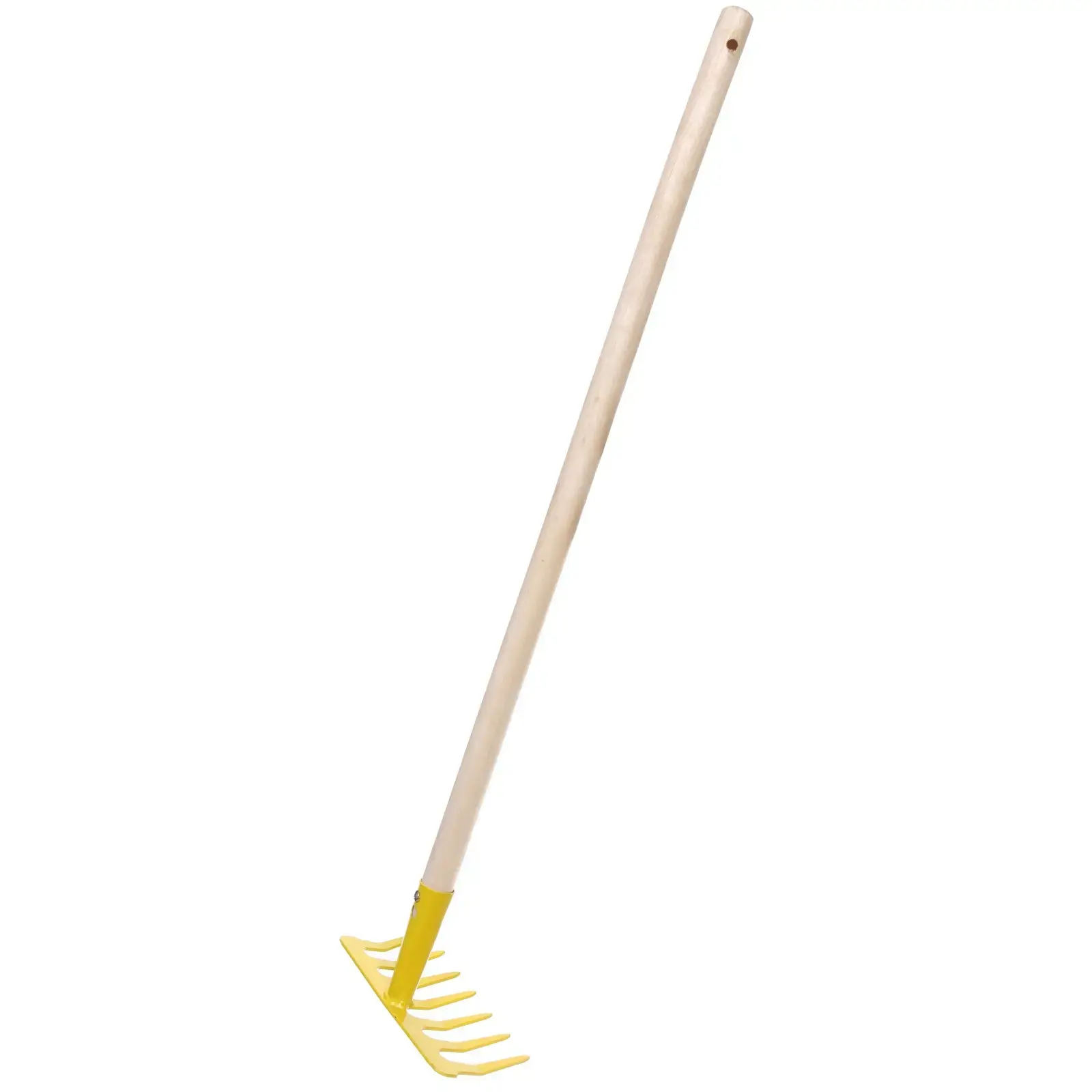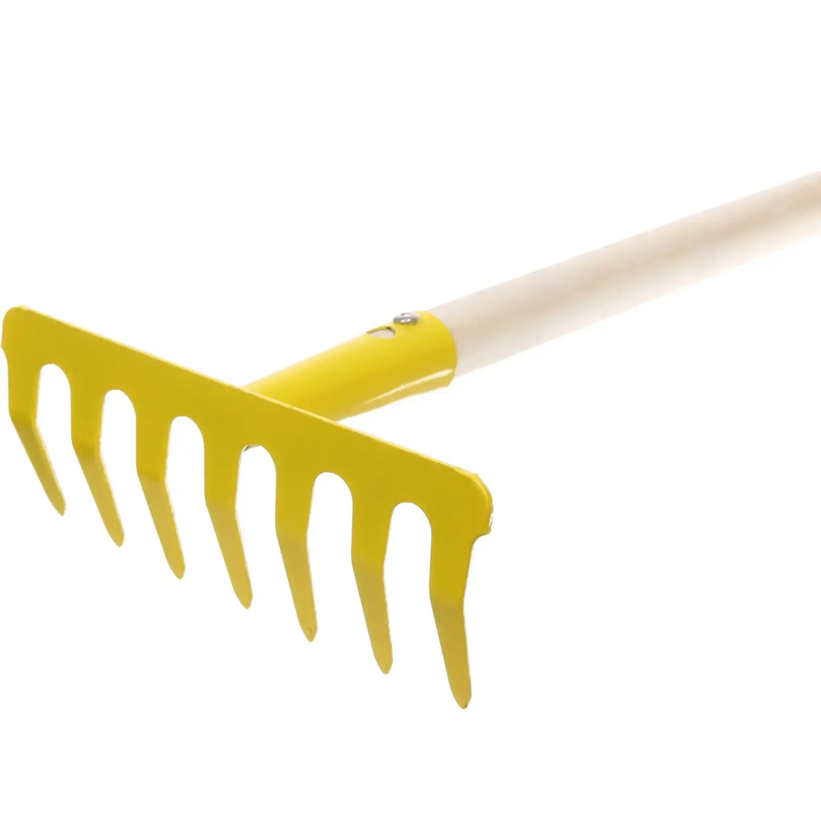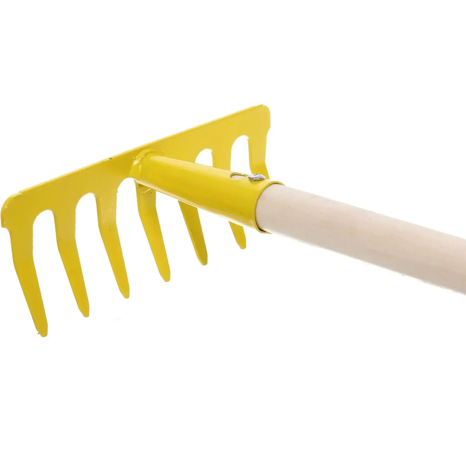 Грабли имеют стандартный размер и конструкцию, что делает их универсальными для различных задач в садоводстве. Рабочая часть инструмента окрашена в яркий желтый цвет, что не только привлекает внимание, но и обеспечивает защиту от коррозии. Деревянная ручка имеет гладкую поверхность и естественный цвет, что делает инструмент эстетически приятным.