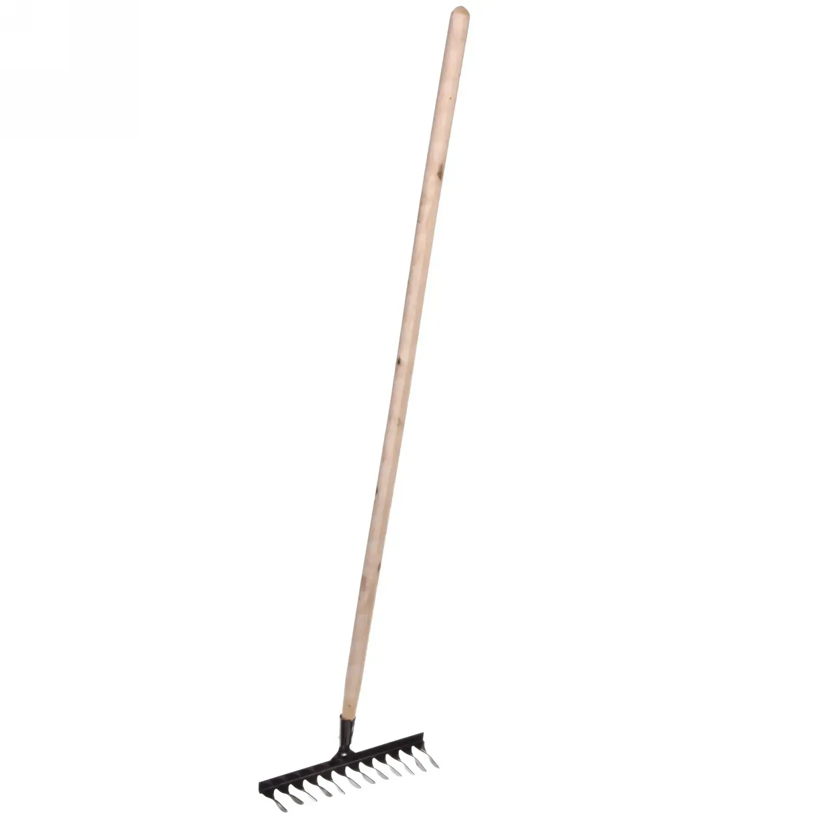 Рабочая часть граблей выполнена из черного металла, а черенок — из светлого дерева. Диаметр тулейки составляет 30 мм, что обеспечивает надежное соединение между рабочей частью и ручкой. Эти грабли — отличный выбор для тех, кто ценит качество и практичность в садовых инструментах.