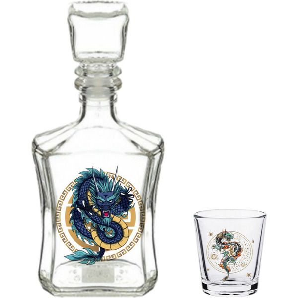 Графин имеет квадратную форму и украшен многоцветной этикеткой с изображением дракона, что подчеркивает его восточный стиль. Стопки также выполнены из прозрачного стекла и декорированы в том же стиле. Набор упакован в удобный чемоданчик, что делает его идеальным для подарка или использования в поездках.