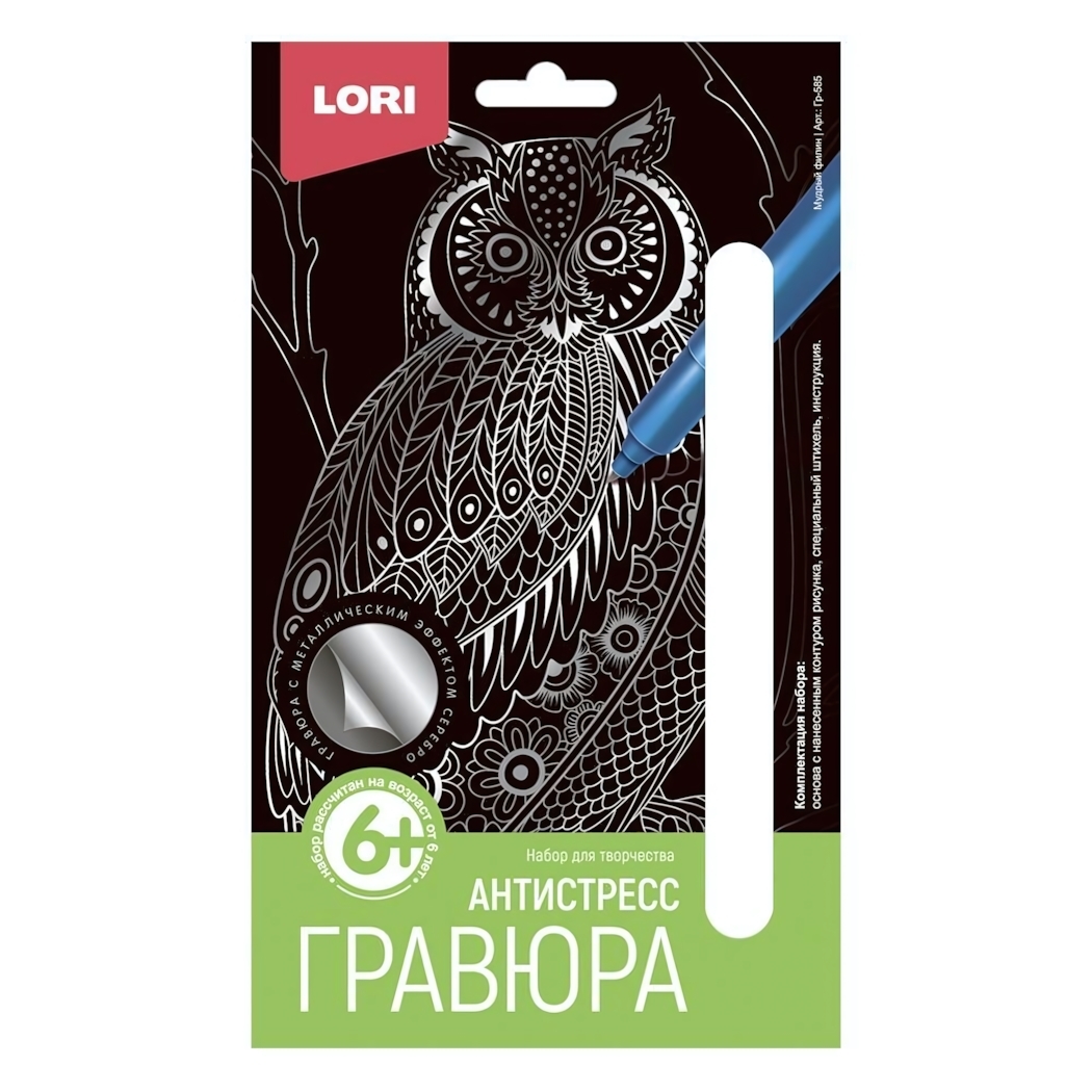Гравюра антистресс "Мудрый филин", 10х15см, серебро, с штихелем и инструкцией