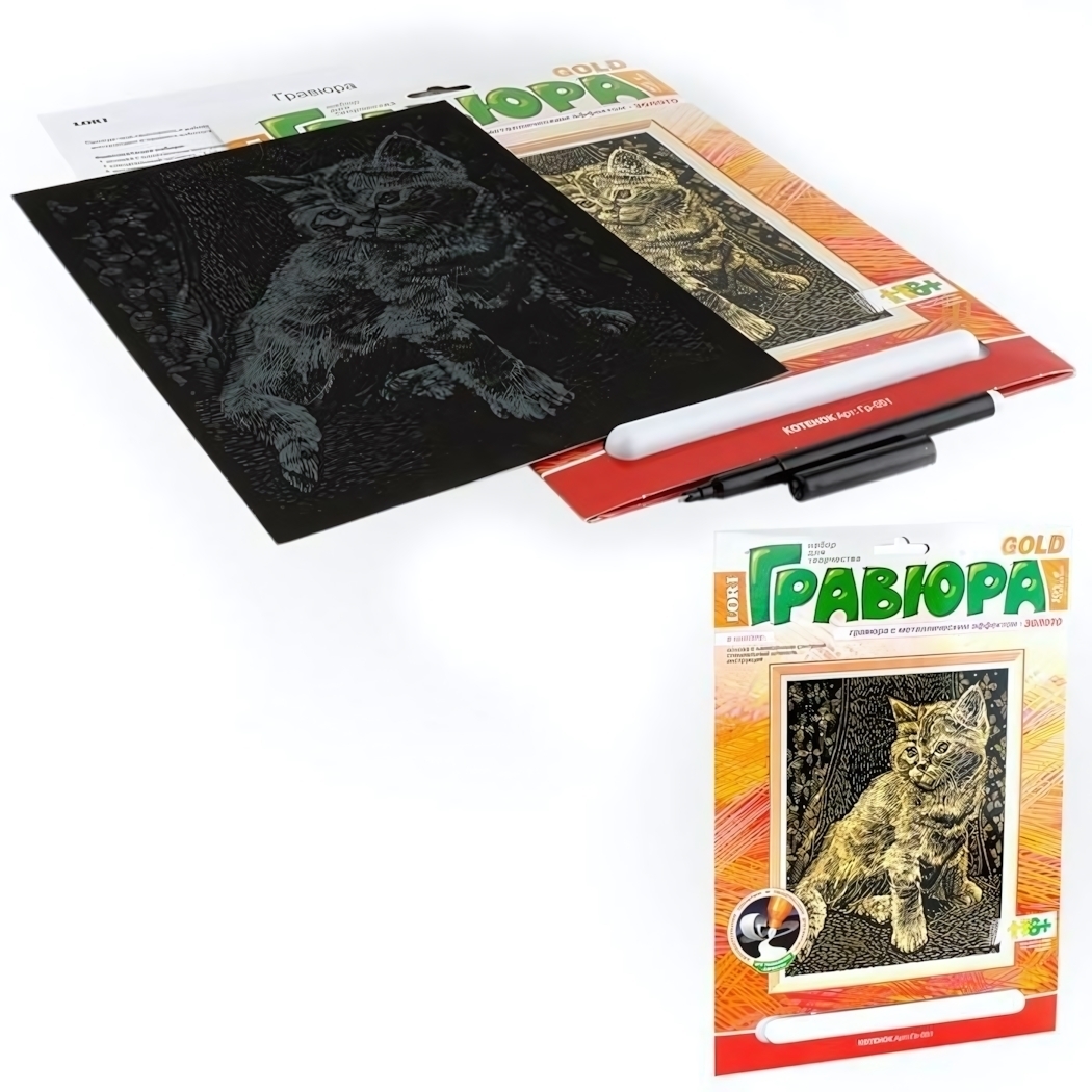 Набор для создания гравюры с золотым эффектом — это увлекательное путешествие в мир искусства для детей от 6 лет. Всего за несколько шагов юный художник сможет создать эффектную картину с милым котенком, которая станет гордостью детской комнаты или трогательным подарком близким.