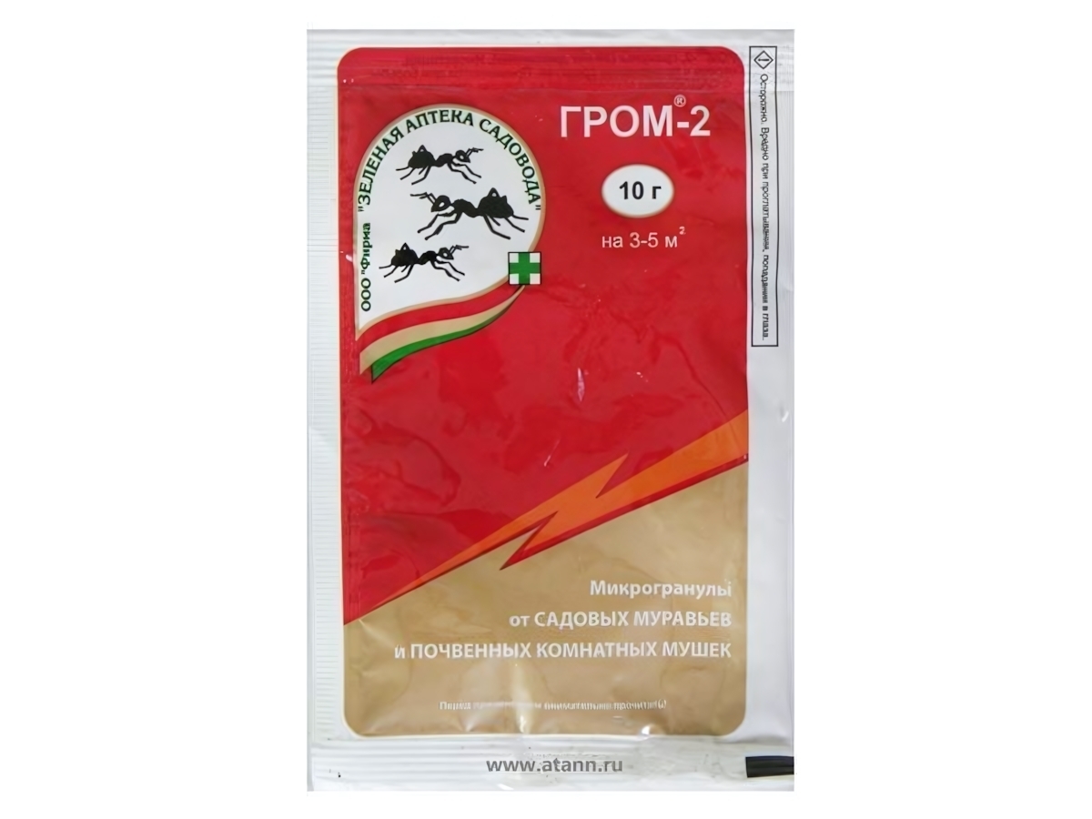 Предлагаем эффективное средство Гром-2М в пакете объемом 10 граммов, специально разработанное для борьбы с разными видами вредителей, таких как муравьи, почвенные мушки и мошки, на даче, в теплицах и в комнатных растениях.