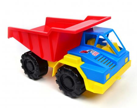 Игрушку легко берут в руки благодаря крупным резиновым колесам, которые крепко держатся на любой поверхности. Кузов можно наклонять назад, чтобы выгрузить внутрь песок, снег или маленькие фигурки. Внутри кабины предусмотрено место для миниатюрного водителя – ребёнок может «садиться за руль» и имитировать работу настоящего водителя.
