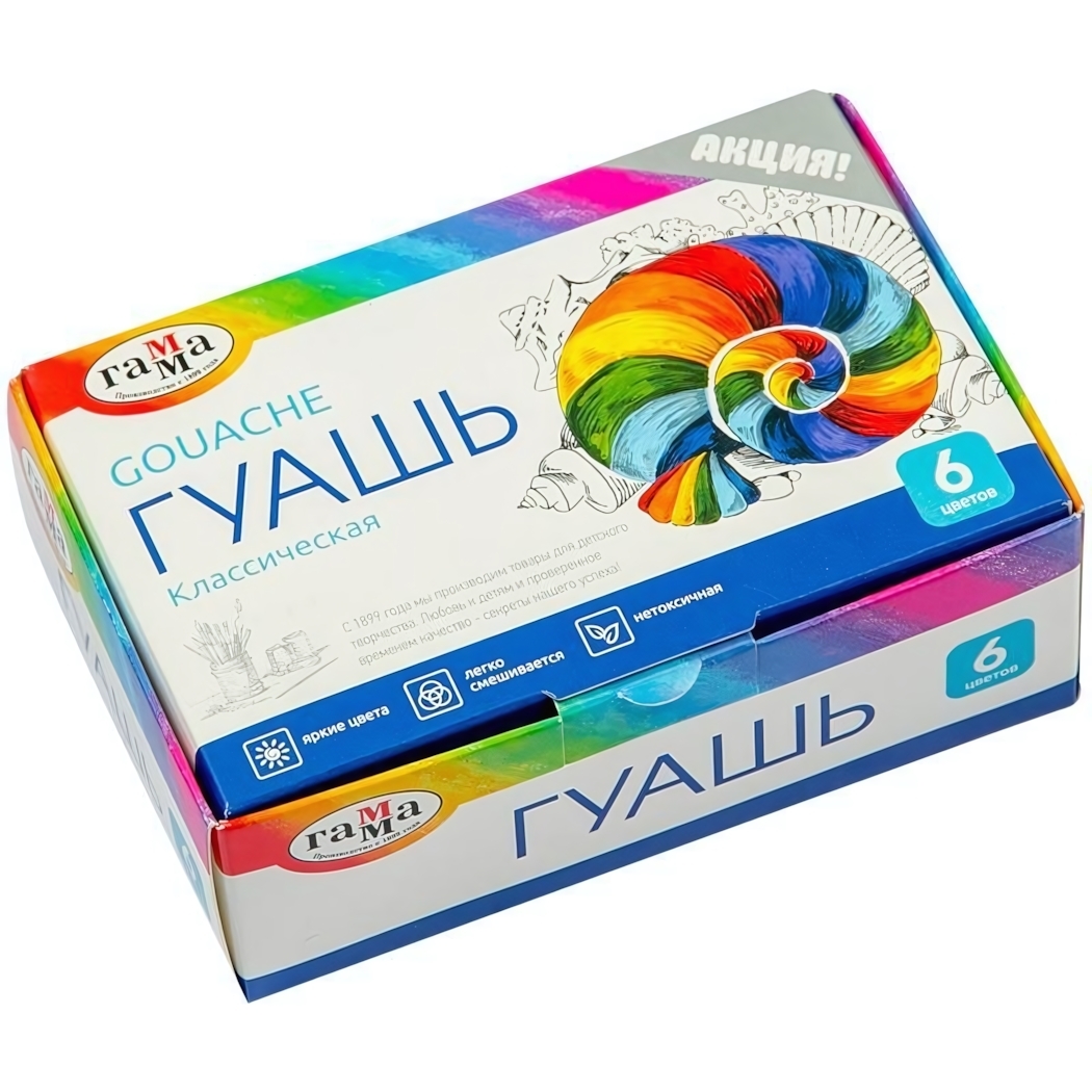Гуашь "Классическая" 6 цветов по 20 мл, яркие смешивающиеся краски для детского творчества