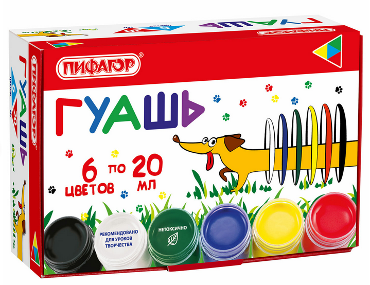 Гуашь "Веселая такса" 6 цветов по 20мл, безопасная для детей, легко смывается