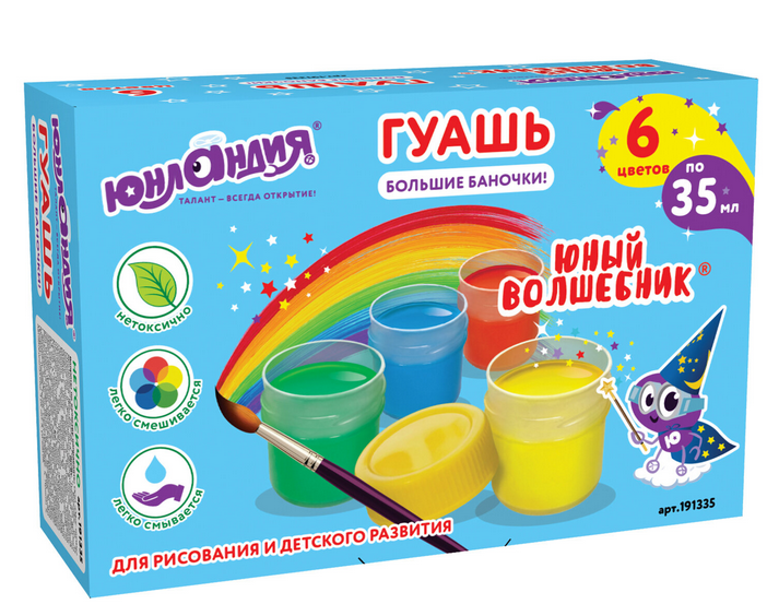 Гуашь "Юный волшебник" от ЮНЛАНДИЯ - идеальный выбор для первых шагов в мире искусства. Безопасные материалы и яркие сочные цвета помогут юному художнику воплотить свои фантазии в реальность.