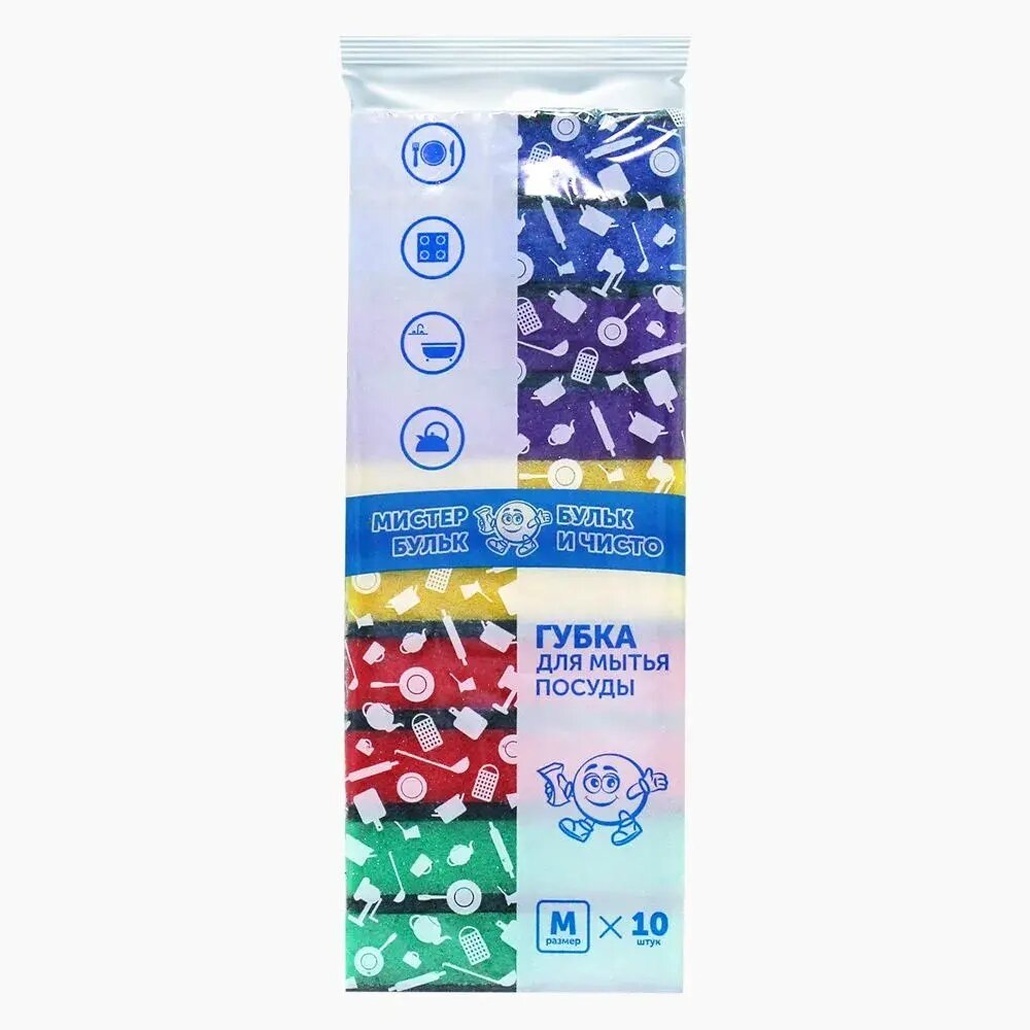 Губка для посуды Мистер Бульк, комплект 10 штук, размер М, цвета в ассортименте