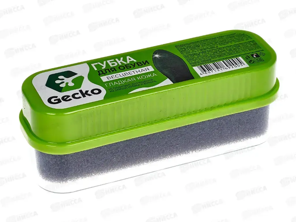 Губка выполнена из поролона и пластика, что обеспечивает ее долговечность и эффективность. Упаковка имеет прямоугольную форму с ярко-зеленым дизайном, что делает ее заметной и привлекательной. Не используйте губку для кожзаменителей и выработки кожи, чтобы избежать повреждений. Поддерживайте свою обувь в идеальном состоянии с губкой GECKO!
