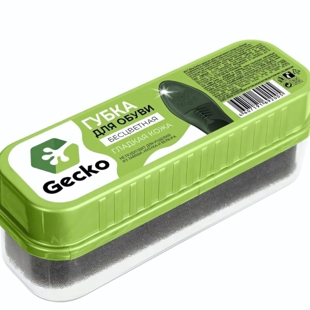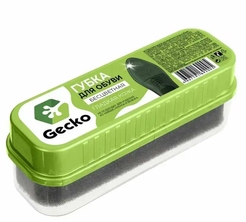 Губка выполнена из поролона и пластика, что обеспечивает её долговечность и надежность. Упаковка имеет прозрачную часть, позволяющую видеть внутренний наполнитель, а также яркий зеленый цвет, который привлекает внимание. Губка GECKO — это не просто средство для ухода, это ваш верный спутник в мире моды и стиля.