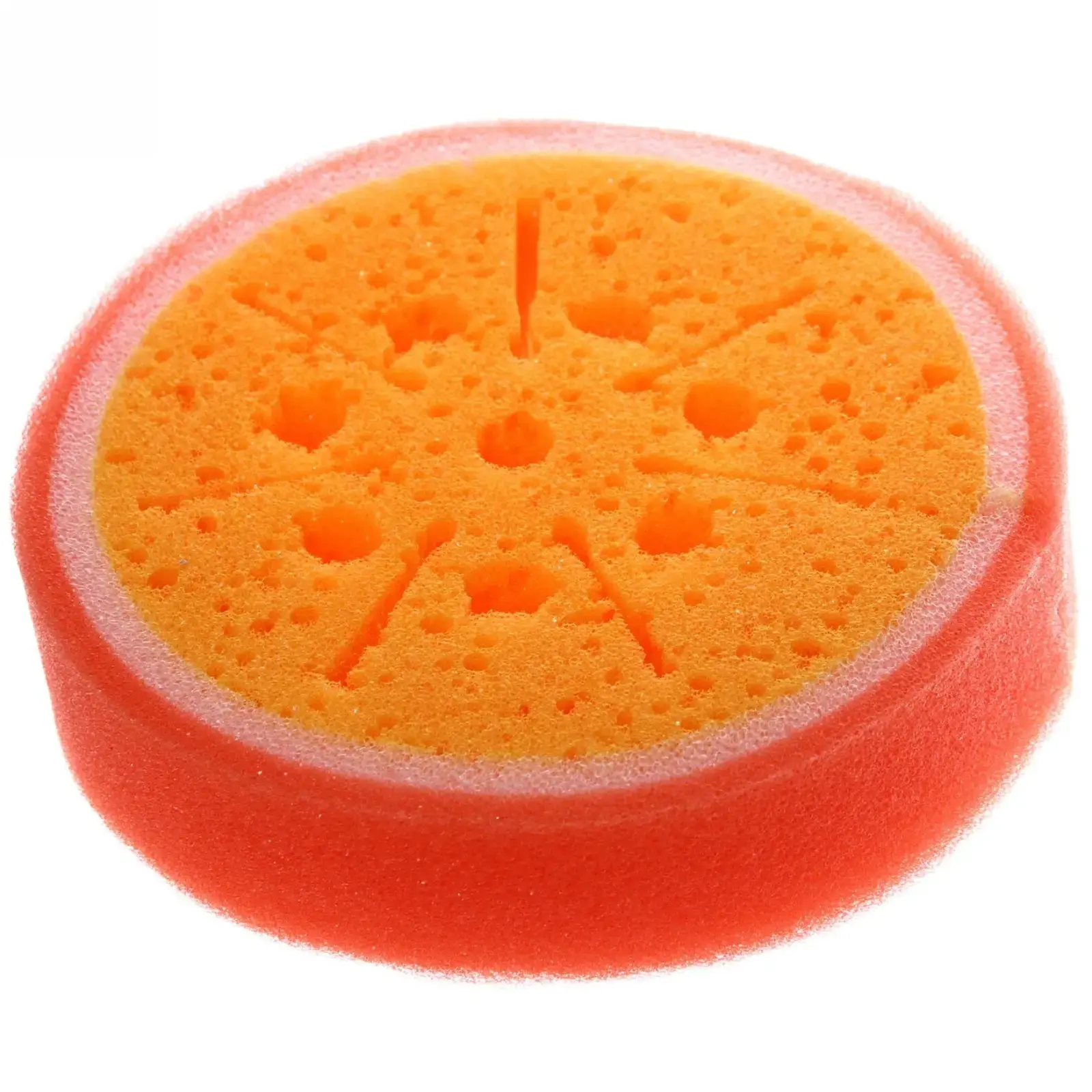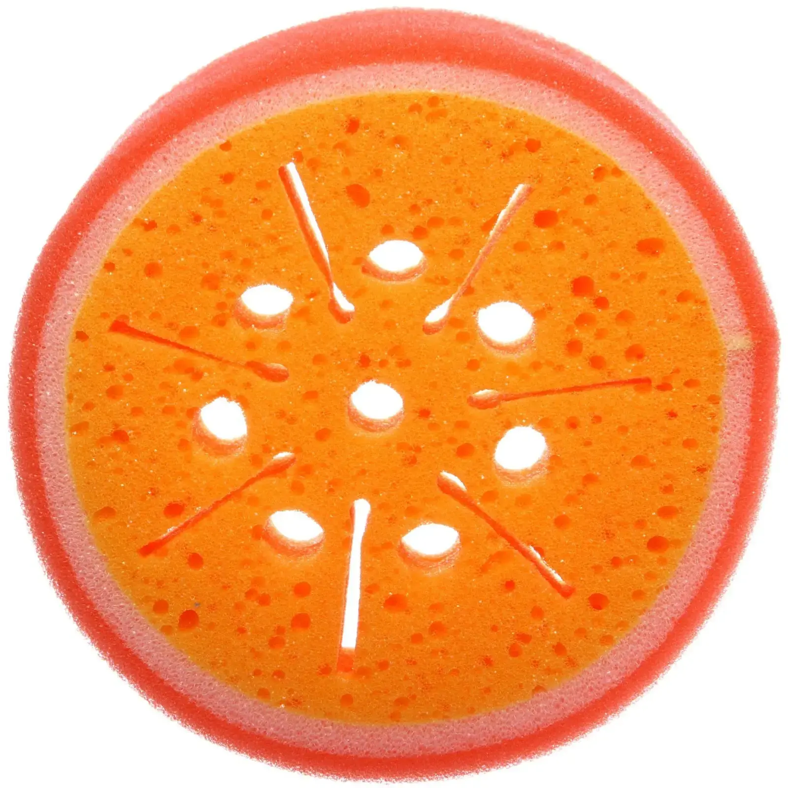 Размер губки составляет 12 см, что делает ее компактной и удобной для хранения. Основной цвет — ярко-оранжевый с красным краем, что придает ей свежий и аппетитный вид. Губка имеет текстурированную поверхность с отверстиями, что создает эффект натурального фрукта и улучшает ее функциональность.