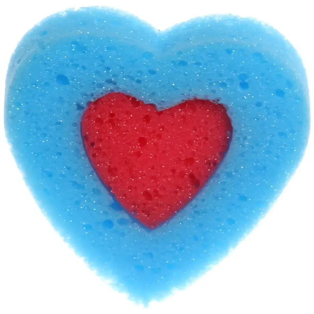 Размер губки составляет 12,5х12 см, что делает её удобной для использования. Основной цвет губки — голубой, а внутренняя часть выполнена в виде красного сердца, что добавляет ей декоративный элемент. Губка содержит блестящие частицы, придающие ей яркий и привлекательный вид.