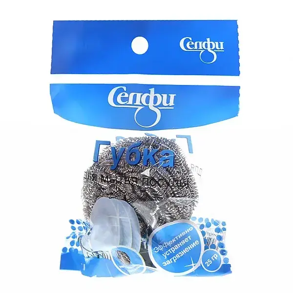Губка имеет округлую форму и выполнена из тонкой металлической проволоки, что обеспечивает ее гибкость и эффективность. Упаковка выполнена в ярко-синих тонах с прозрачным окном, позволяющим видеть продукт внутри. Не упустите возможность сделать вашу кухню более чистой и гигиеничной с помощью нашей металлической губки!