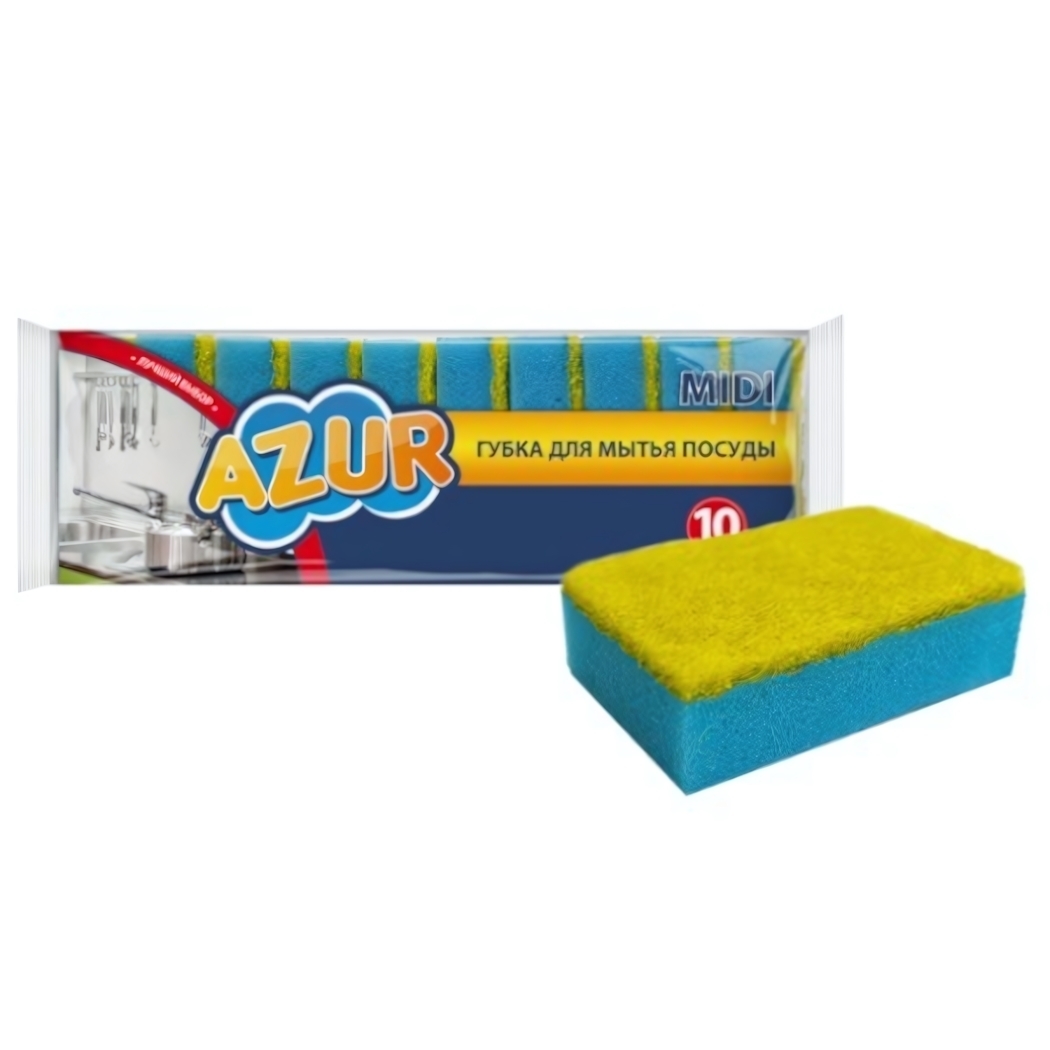 В упаковке содержится 10 губок, что обеспечивает длительное использование. Модель 'MIDI' от известного производителя AZUR зарекомендовала себя как надежный помощник на кухне.