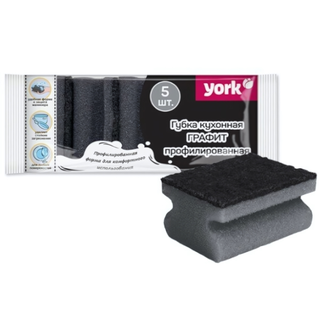 Губки для посуды двухслойные, набор из 5 штук, графит, 8,5х6,5х4 см, поролон 18кг/м³, фибра 500г/м² YORK