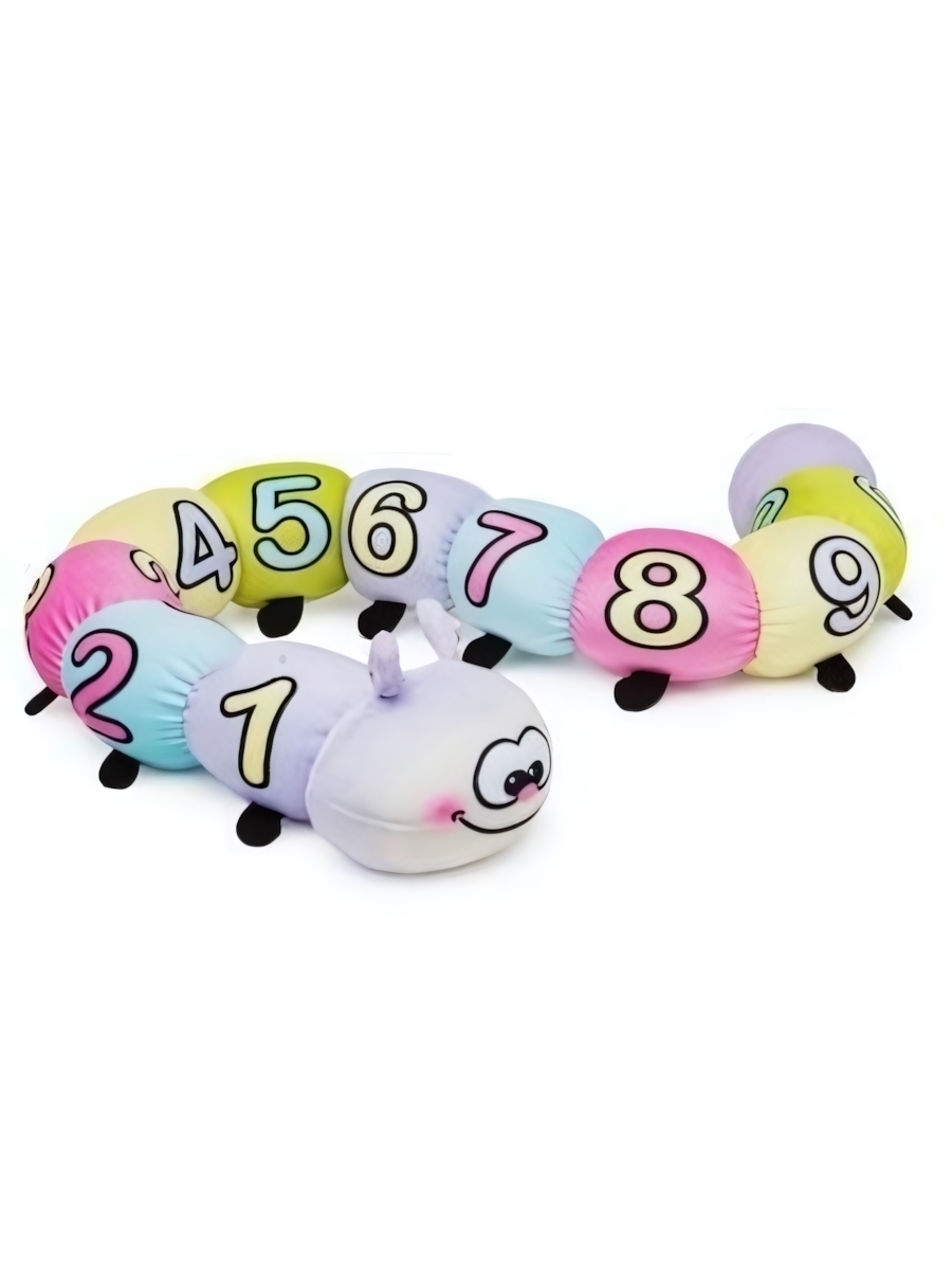 Гусеница состоит из нескольких сегментов, каждый из которых окрашен в пастельные оттенки и украшен цифрами от 1 до 9 — это помогает малышу учиться и запоминать цифры в игровой форме. Размер изделия 98*14*11 см идеально подходит для названия, хранения и переноски.
