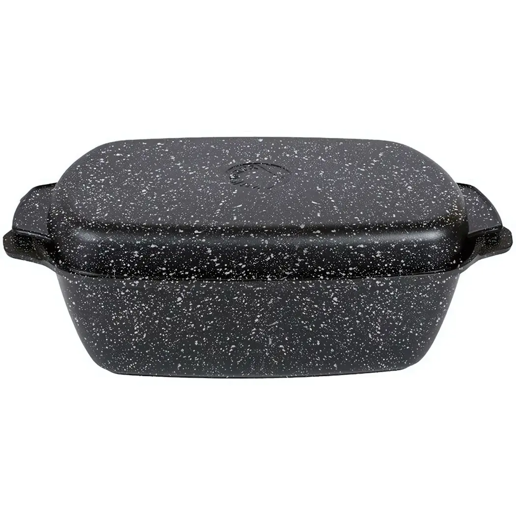 Гусятница выполнена из литого алюминия, что гарантирует её прочность и долговечность. Черный цвет с белыми вкраплениями придаёт ей стильный вид, а прямоугольная форма позволяет удобно размещать её в духовке. Размеры 5,5л делают её идеальной для приготовления блюд на большую семью или компанию.
