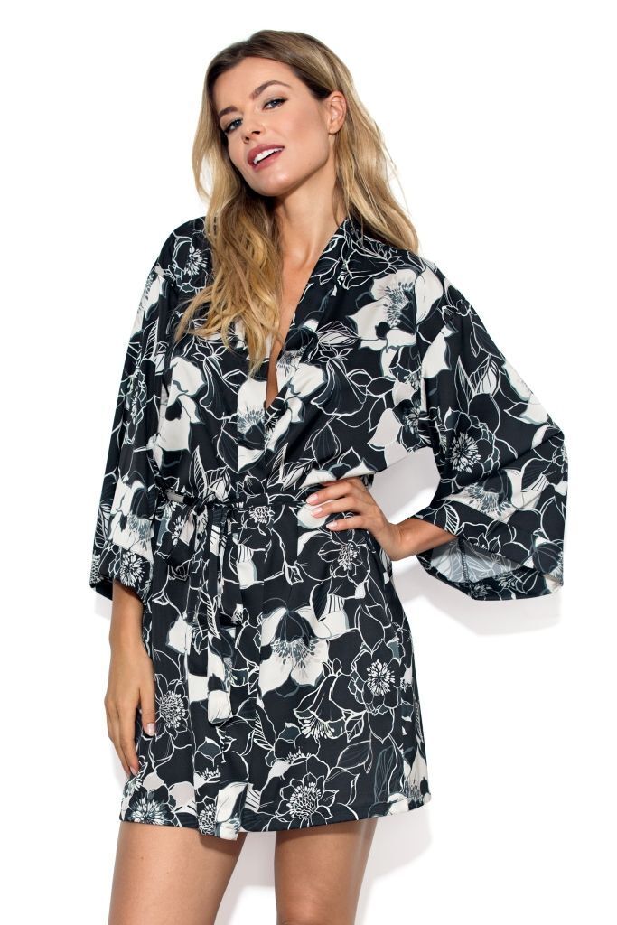 Халат-кимоно 'Filipa' создан для тех, кто ценит уют и стиль в домашней одежде. Его нежный цветочный принт в сочетании с благородным черно-бежевым оттенком добавит изысканности вашему образу.