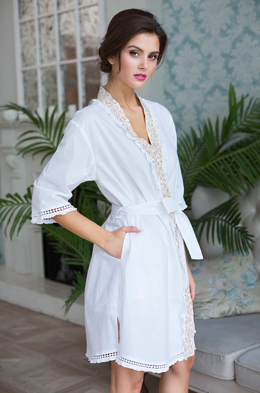 Халат из 100% хлопка с V-образным вырезом создан для тех, кто ценит удобство и элегантность в повседневной жизни. Мягкая дышащая ткань обеспечивает комфорт в любое время года, а классический бело-голубой цвет добавит свежести вашему образу.