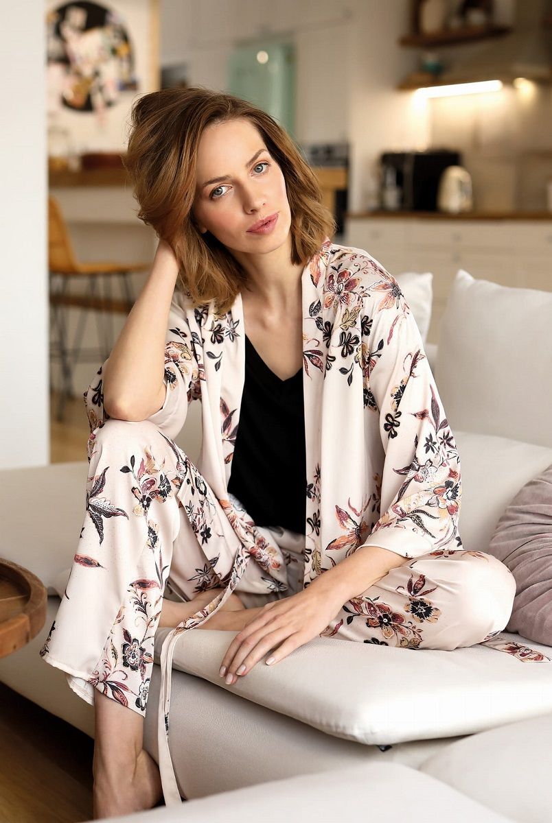 - Универсальный бежевый оттенок с цветочными мотивами сочетается с любой домашней одеждой