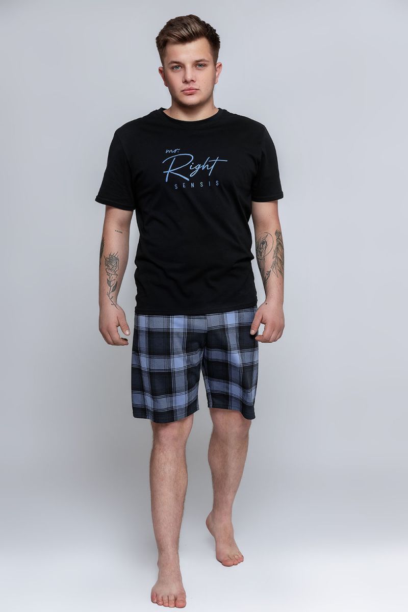 Комплект состоит из футболки и шорт. Футболка свободного кроя с короткими рукавами и круглым вырезом не сковывает движения и подходит для ежедневной носки. На груди размещен аккуратный принт с надписью, который добавляет образу индивидуальности. Шорты прямого кроя длиной до колена выполнены в крупную клетку в черно-синей гамме и дополнены мягкой широкой резинкой на поясе для комфортной посадки без давления.