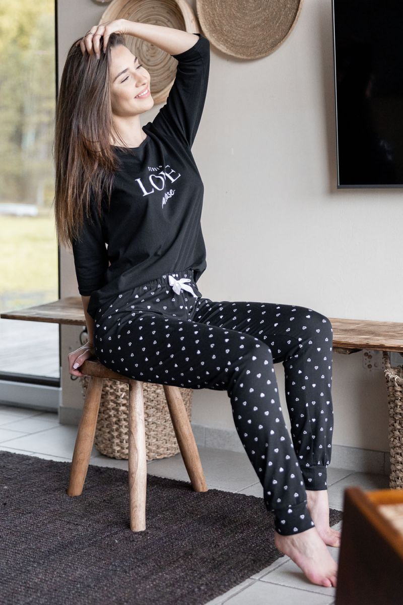 - Стильный дизайн с романтичными деталями — принт в виде сердечек на брюках и надпись на груди