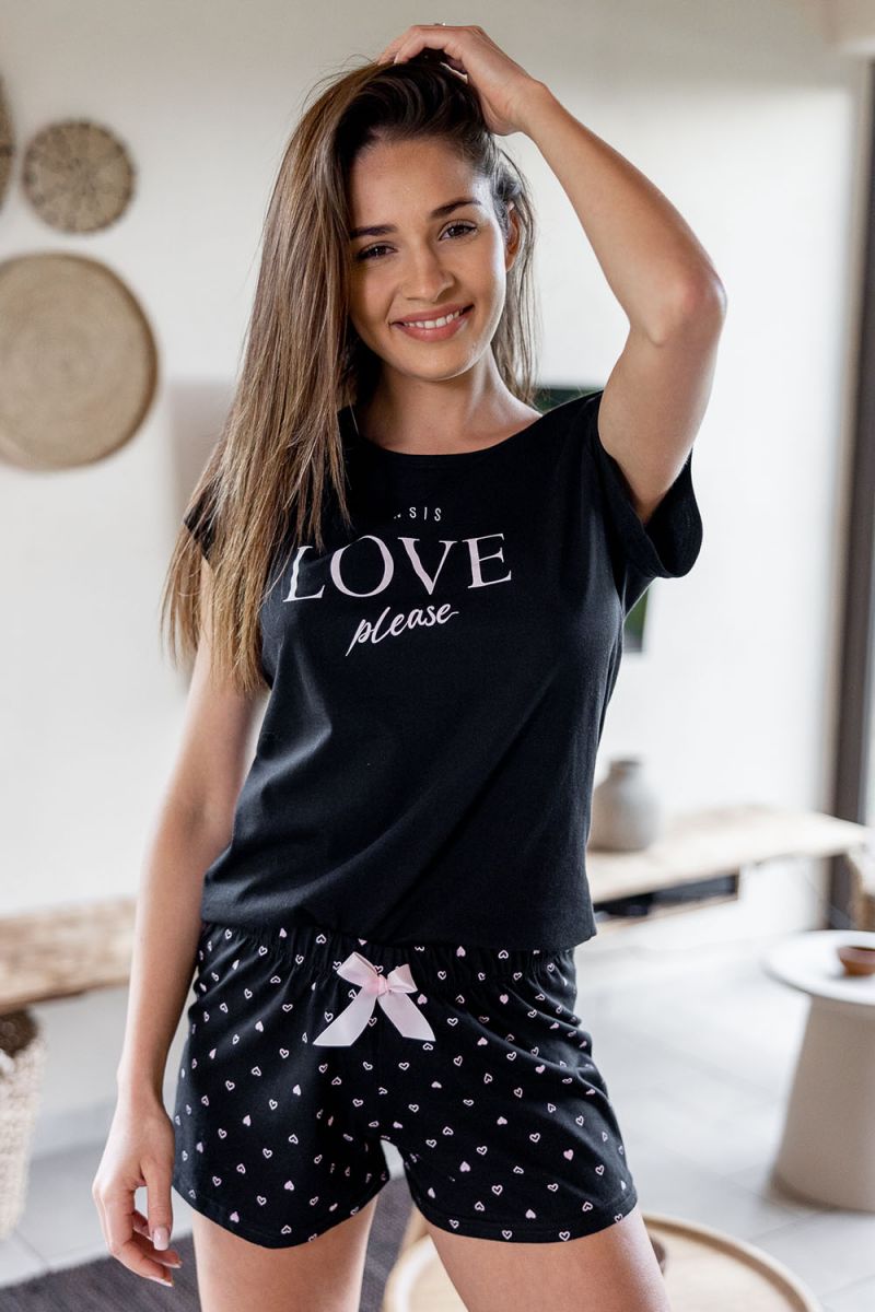 Комплект выполнен в классическом черном цвете, который всегда выглядит стильно и практичен в уходе. Шорты украшены мелким принтом в виде белых и розовых сердечек, что добавляет образу игривости и романтичности. Такой дизайн делает пижаму не просто домашней одеждой, а приятным элементом гардероба, в котором можно чувствовать себя привлекательно даже дома.