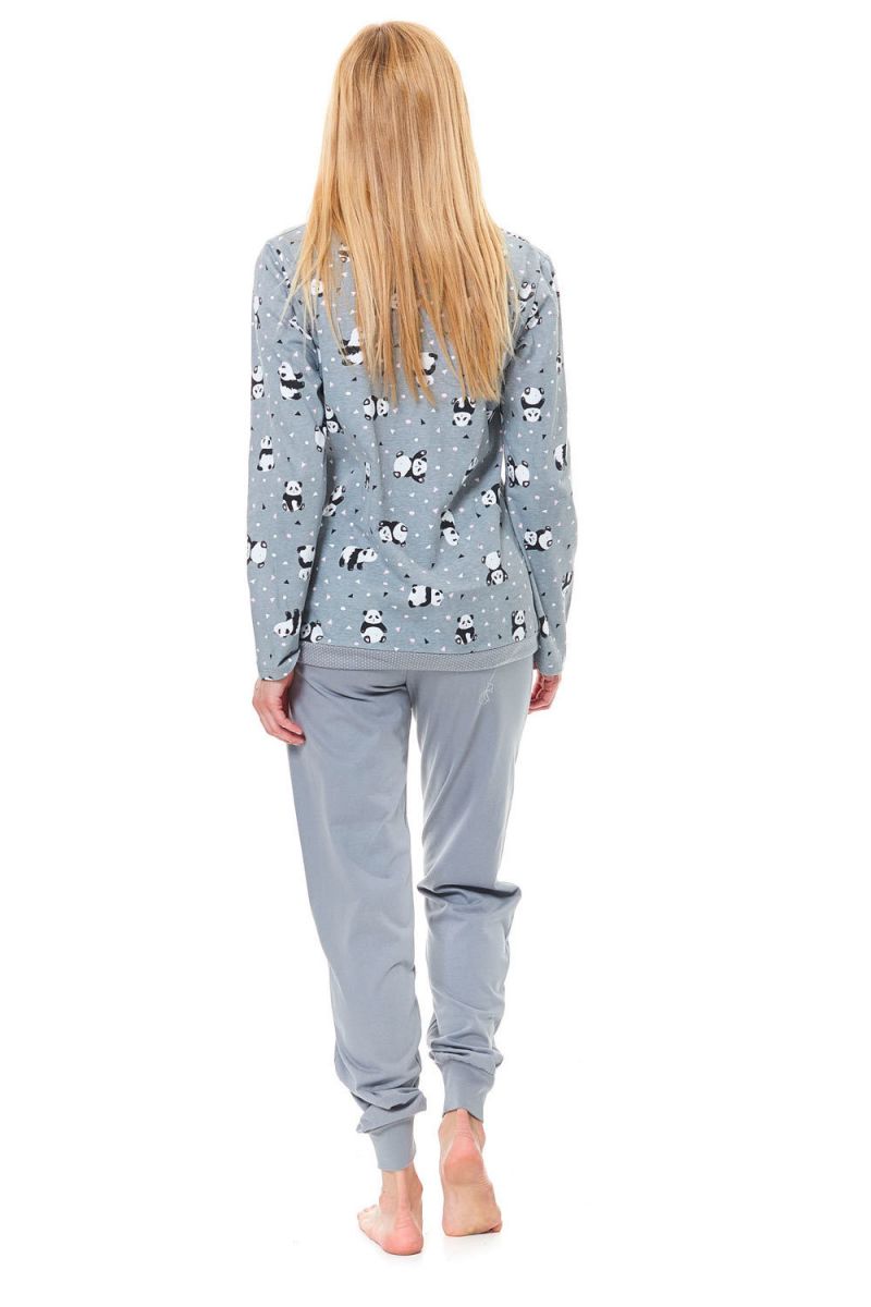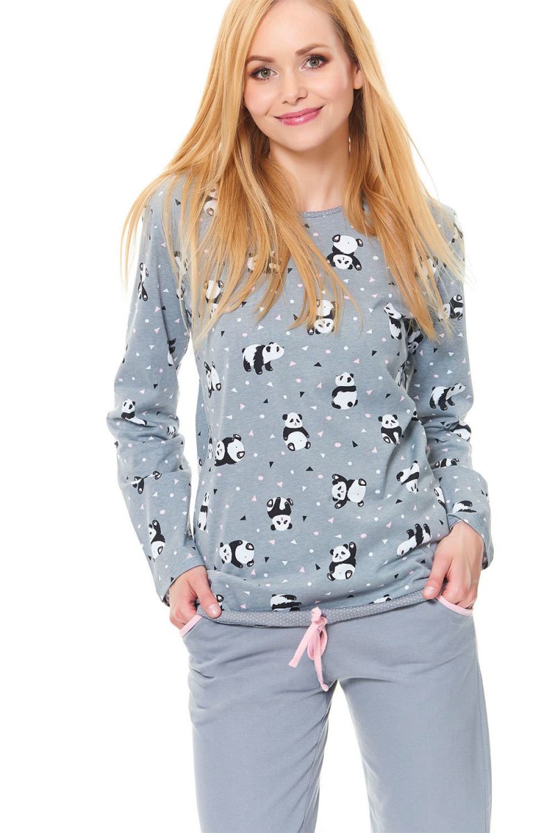 Кофта свободного кроя с круглым вырезом горловины и длинными рукавами украшена оригинальным принтом с изображением панд, треугольников и сердечек. Брюки имеют эластичную резинку на поясе с декоративным шнурком и манжеты внизу, которые обеспечивают идеальную посадку и не задираются во время сна.
