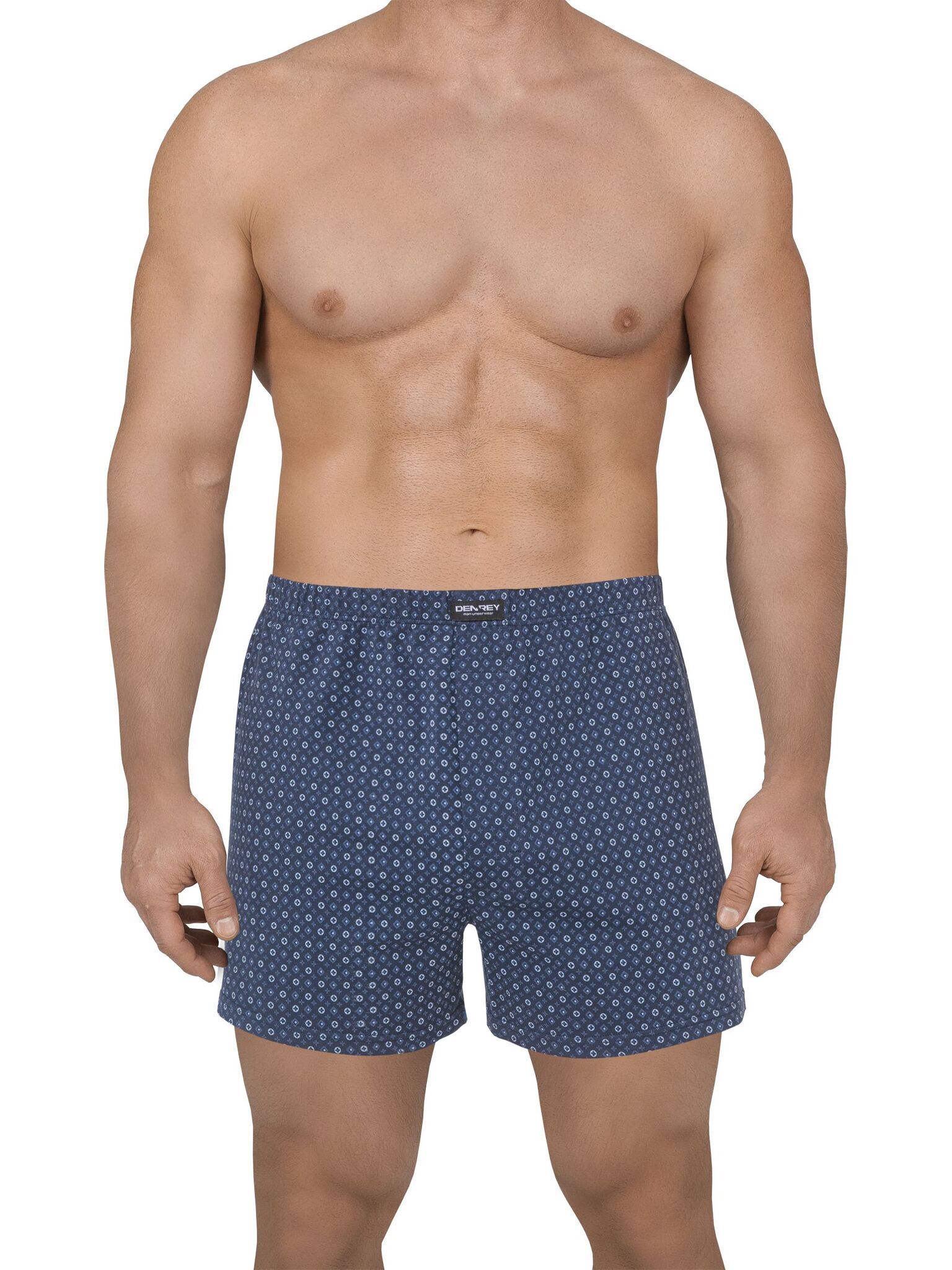 Тёмно-синий базовый цвет с мелким геометрическим принтом сочетается с любой одеждой. Умеренно свободный крой средней длины подходит для повседневной носки и занятий спортом. Специальная обработка ткани сохраняет форму после многократных стирок.