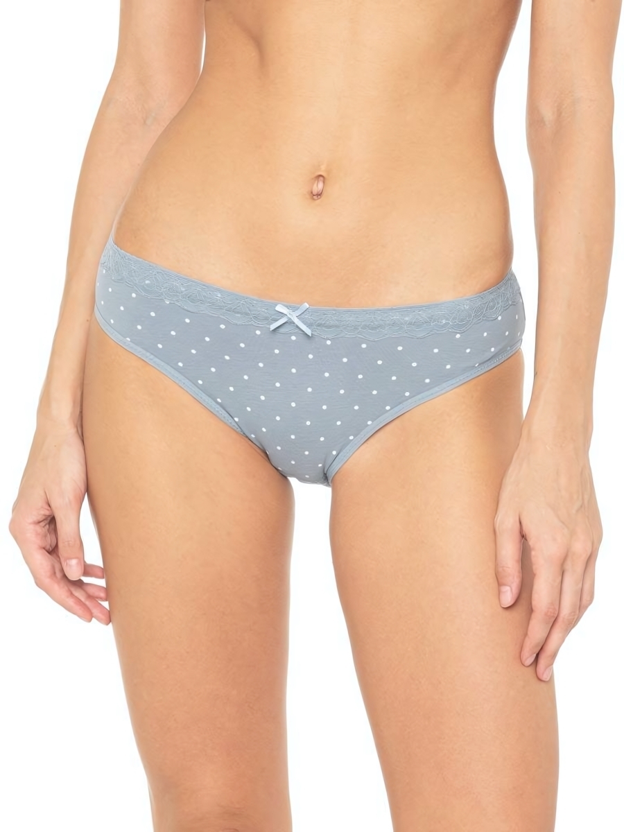 Представляем вам хлопковые трусики-слипы, которые обеспечат вам максимальный комфорт и уверенность в любой ситуации. Эти трусики выполнены из высококачественного хлопка с добавлением спандекса, что делает их мягкими и эластичными. Серый цвет с контрастным принтом в горошек добавляет игривости и стиля, а кружевная отделка по верхнему краю придаёт изделию изысканный вид.