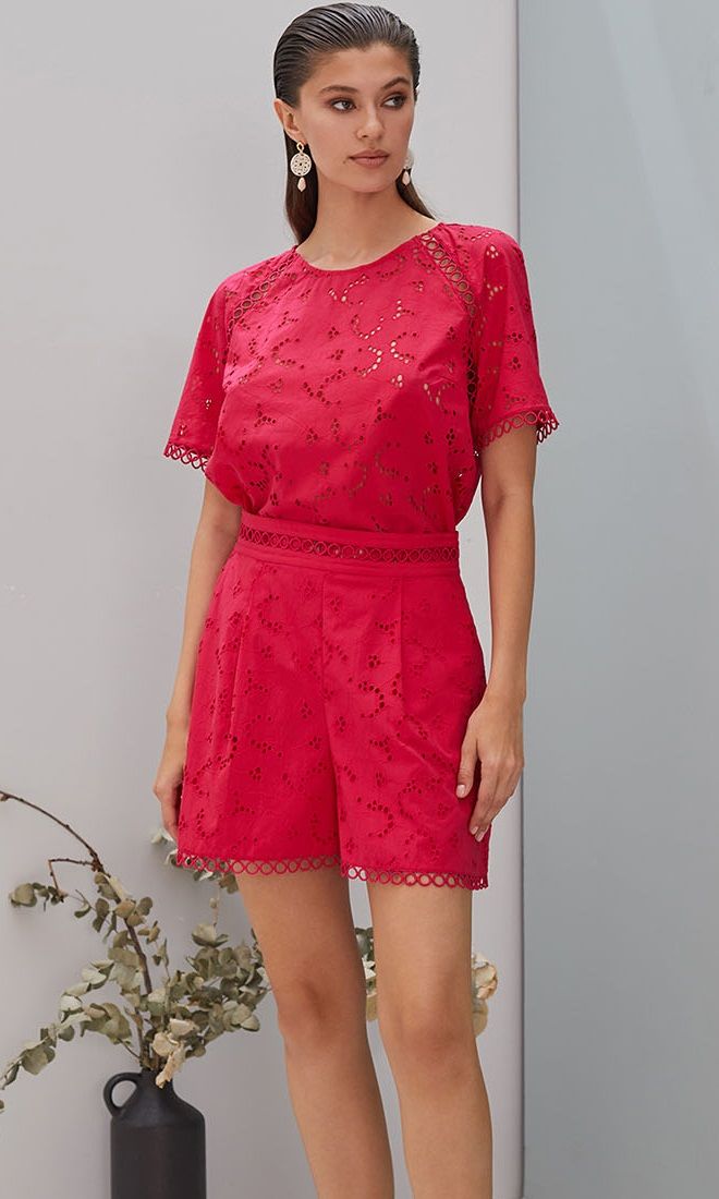 Шорты представлены в насыщенном ярко-розовом цвете, который поднимает настроение. Длина модели — выше колена, что обеспечивает максимальную свободу и прохладу. Ажурный узор и перфорация на ткани добавляют лёгкости и визуальной привлекательности.